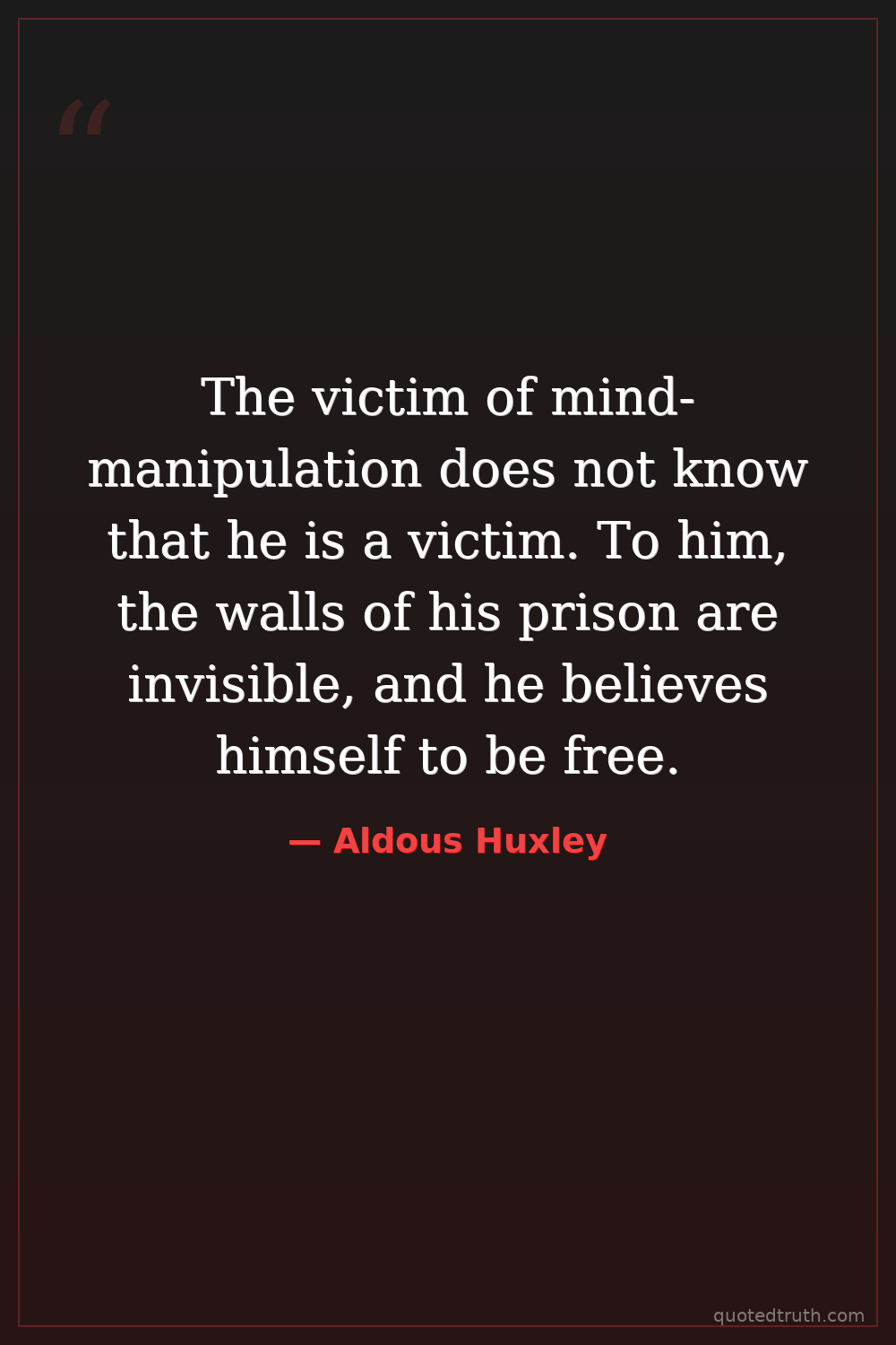 The victim of mind-manipulation does not know that he is a victim. To him, the walls of his prison are invisible, and he believes himself to be free.
