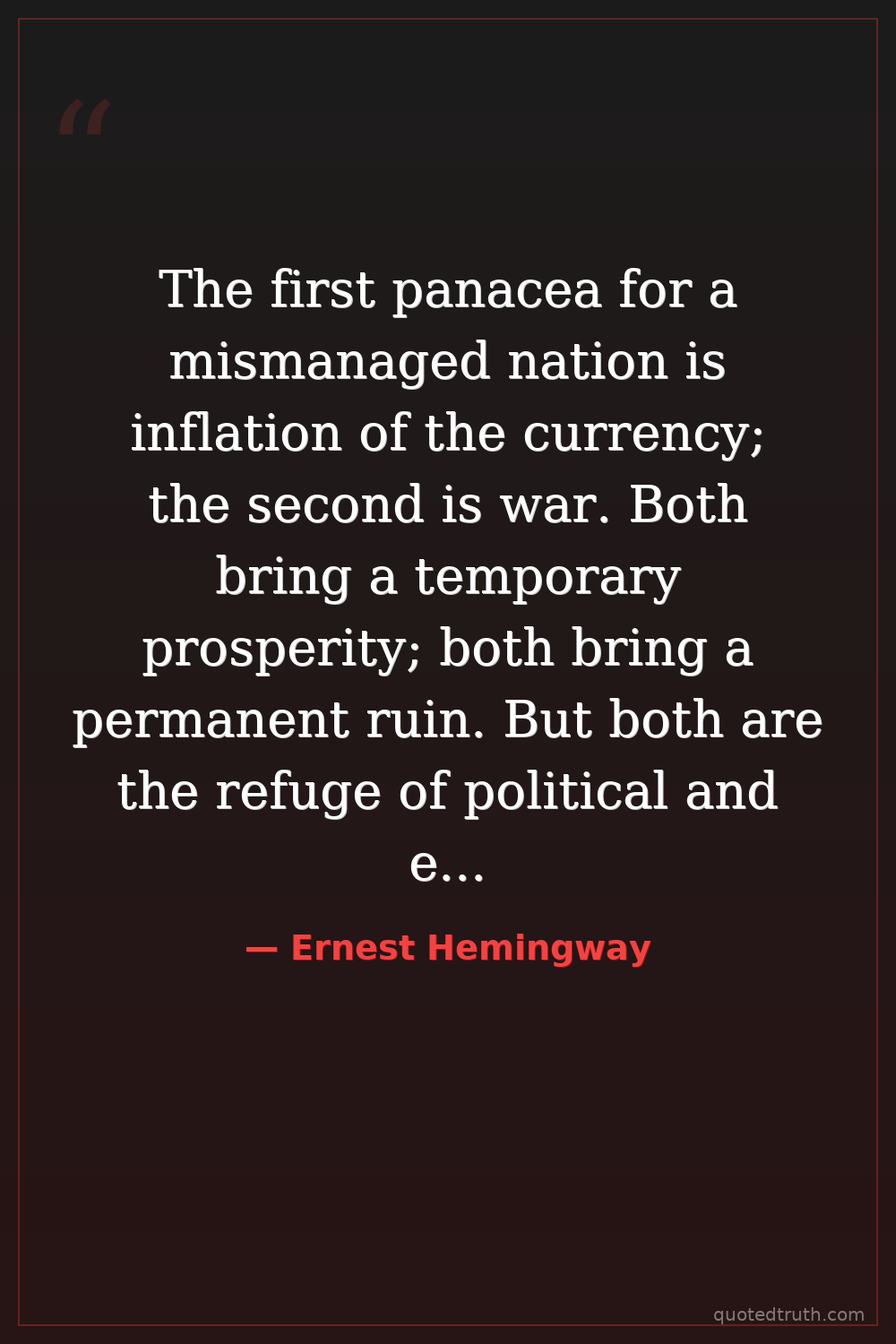 The first panacea for a mismanaged nation is inflation of the currency; the second is war. Both bring a temporary prosperity; both bring a permanent ruin. But both are the refuge of political and economic opportunists.