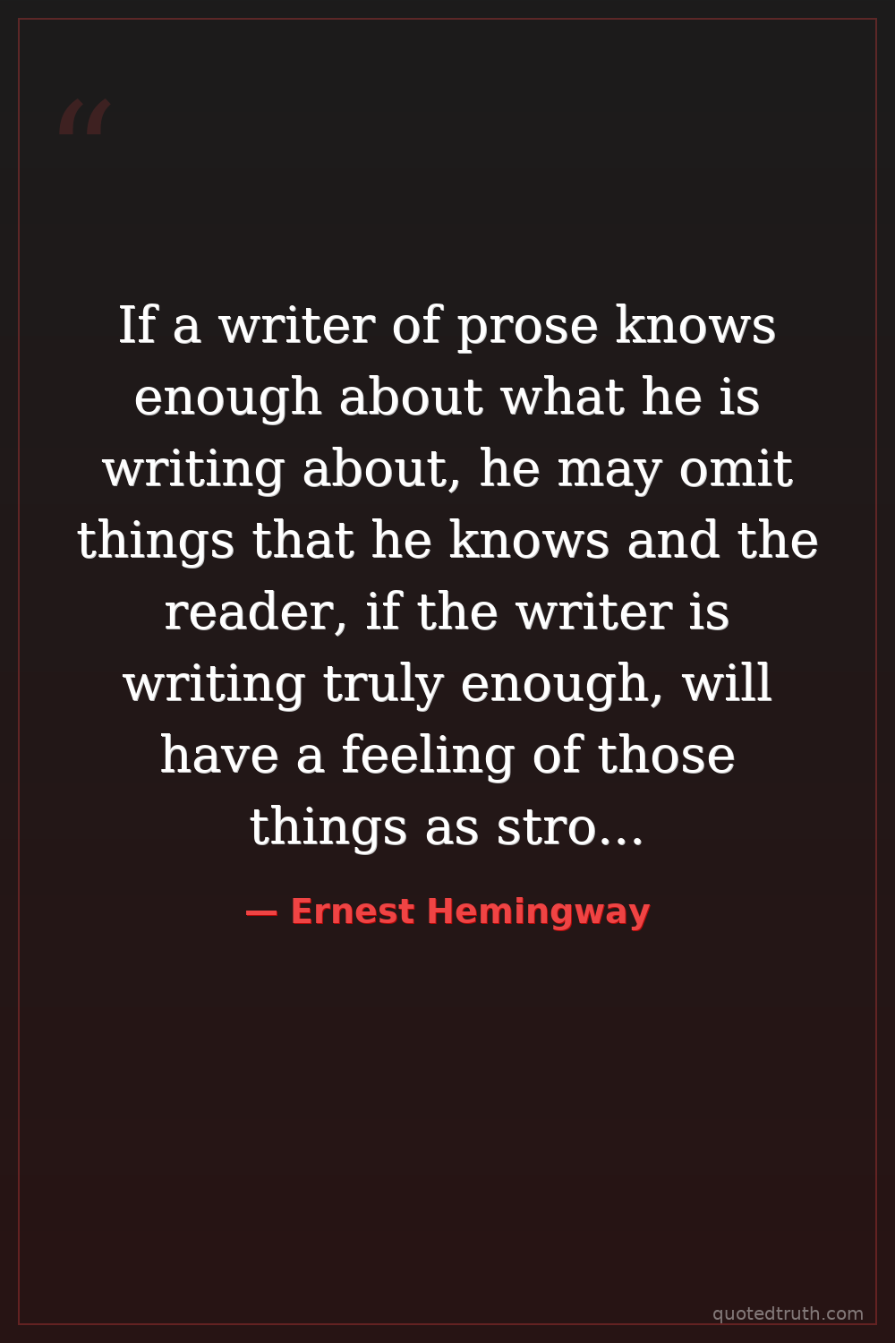 If a writer of prose knows enough about what he is writing about, he may omit things that he knows and the reader, if the writer is writing truly enough, will have a feeling of those things as strongly as though the writer had stated them. The dignity of movement of an iceberg is due to only one-eighth of it being above water.