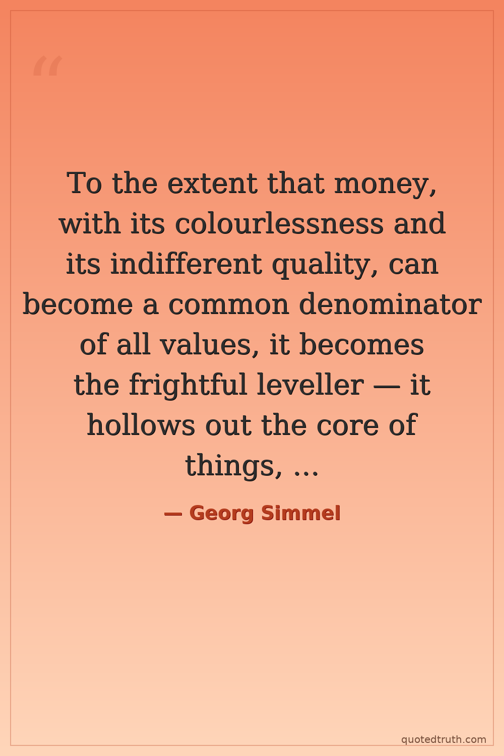 To the extent that money, with its colourlessness and its indifferent quality, can become a common denominator of all values, it becomes the frightful leveller — it hollows out the core of things, their peculiarities, their specific values and their uniqueness and incomparability in a way which is beyond repair.