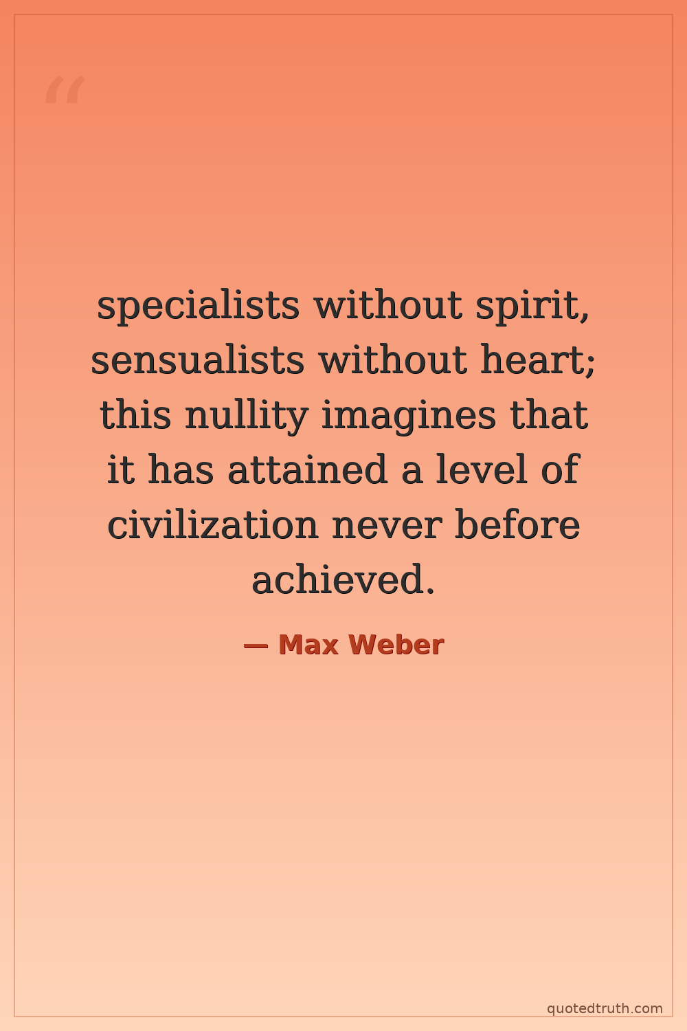 specialists without spirit, sensualists without heart; this nullity imagines that it has attained a level of civilization never before achieved.