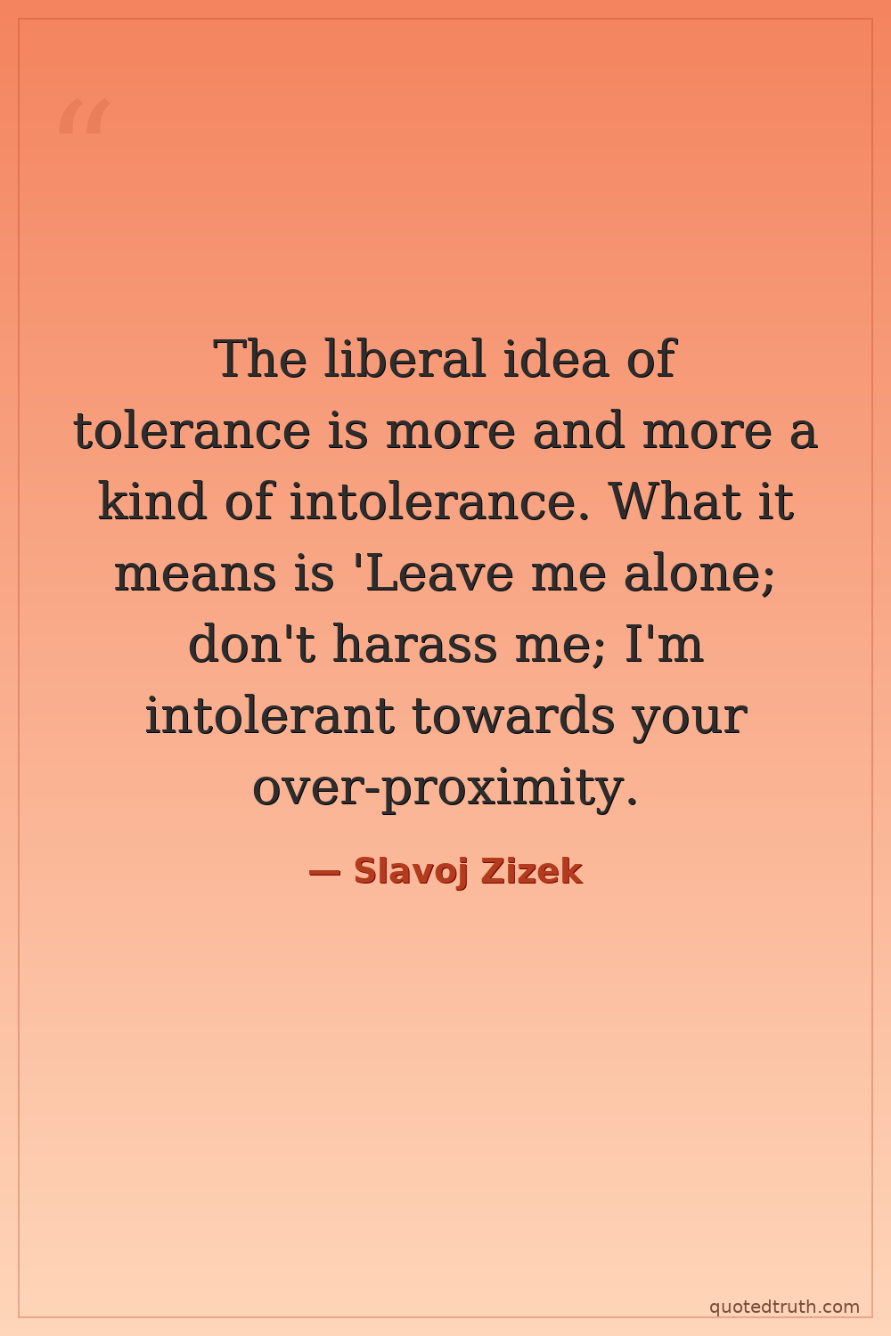 The liberal idea of tolerance is more and more a kind of intolerance. What it means is 'Leave me alone; don't harass me; I'm intolerant towards your over-proximity.