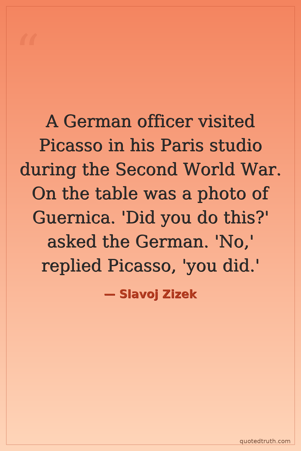 A German officer visited Picasso in his Paris studio during the Second World War. On the table was a photo of Guernica. 'Did you do this?' asked the German. 'No,' replied Picasso, 'you did.'