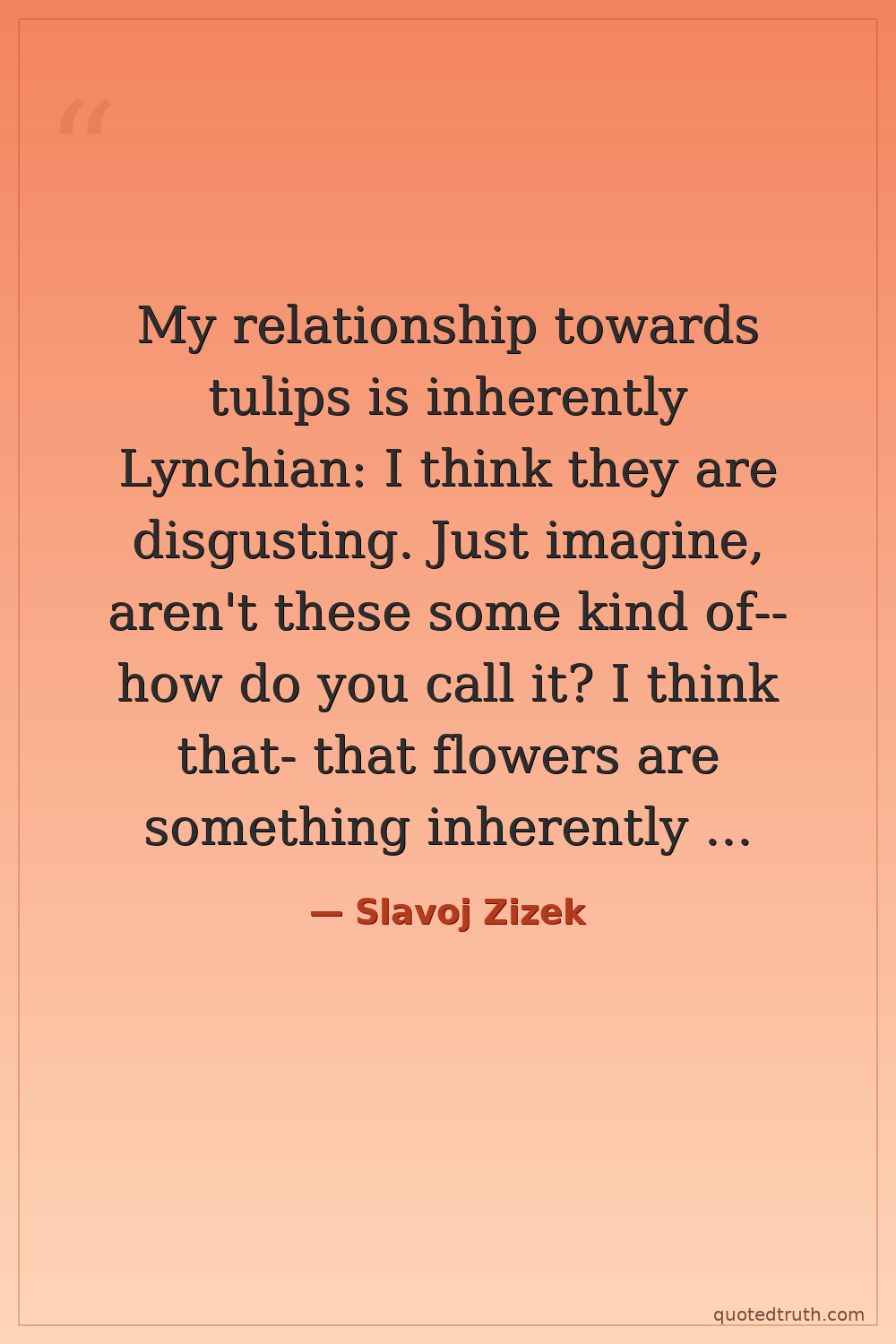 My relationship towards tulips is inherently Lynchian: I think they are disgusting. Just imagine, aren't these some kind of--how do you call it? I think that- that flowers are something inherently disgusting. I mean, are people aware what a horrible thing these flowers are? I mean, basically, it's an open invitation to all- to all- to- to all the insects and bees, "Come and screw me." You know? I mean, it's-- I think that flowers should be forbidden to children.