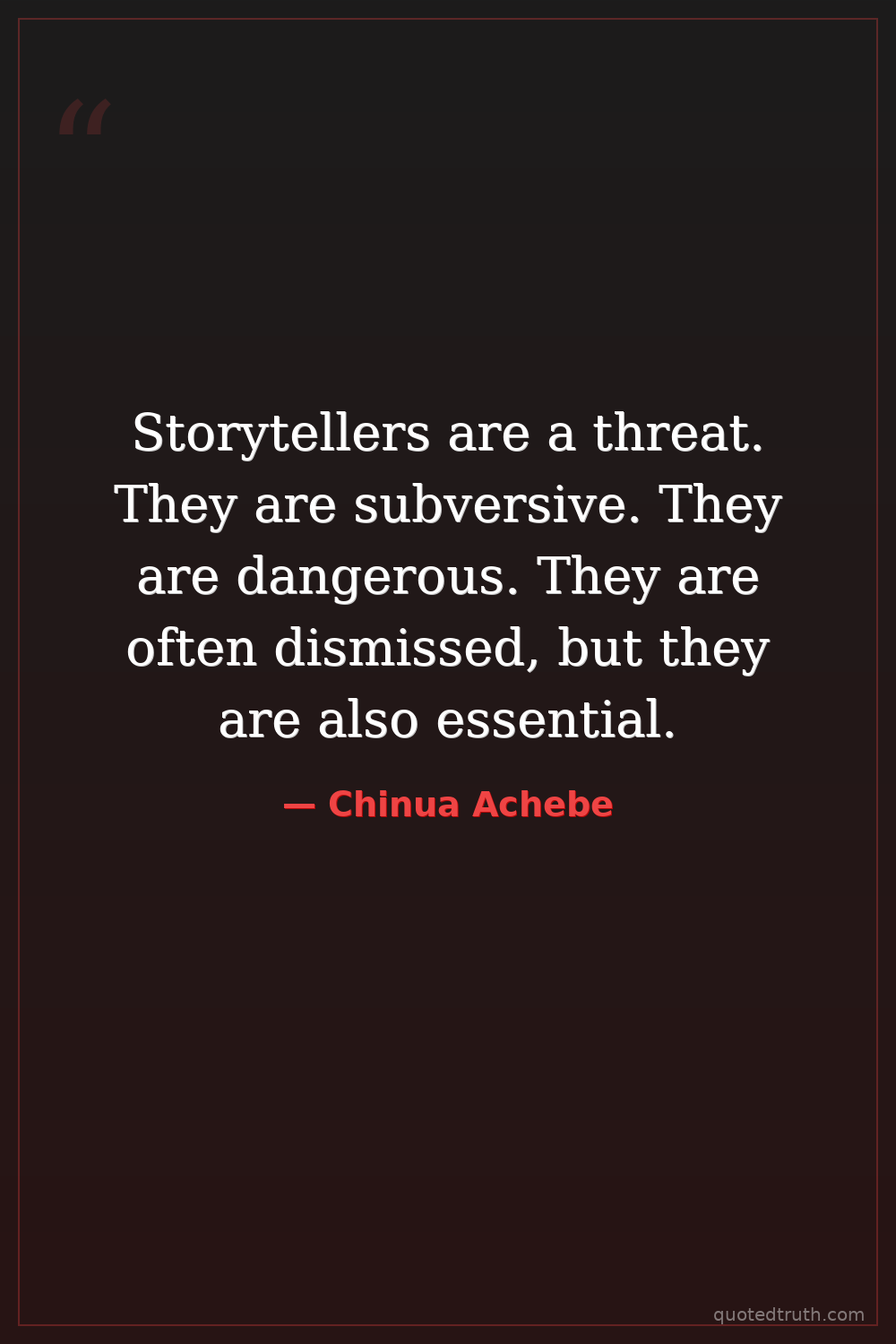 Storytellers are a threat. They are subversive. They are dangerous. They are often dismissed, but they are also essential.