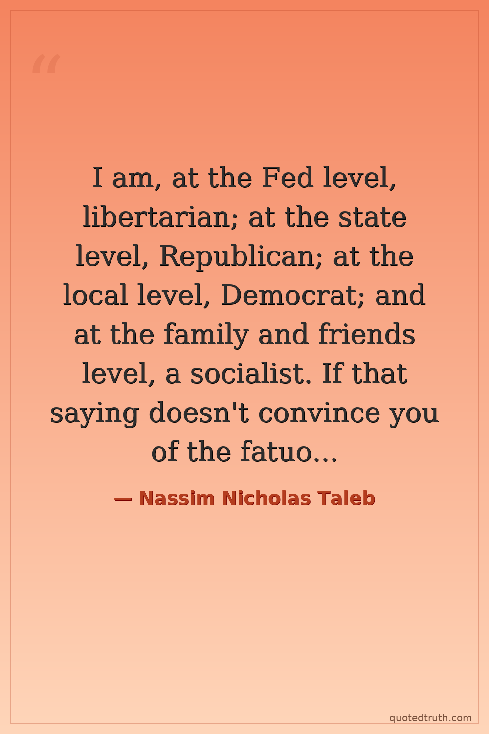 I am, at the Fed level, libertarian; at the state level, Republican; at the local level, Democrat; and at the family and friends level, a socialist. If that saying doesn't convince you of the fatuousness of left vs. right labels, nothing will.
