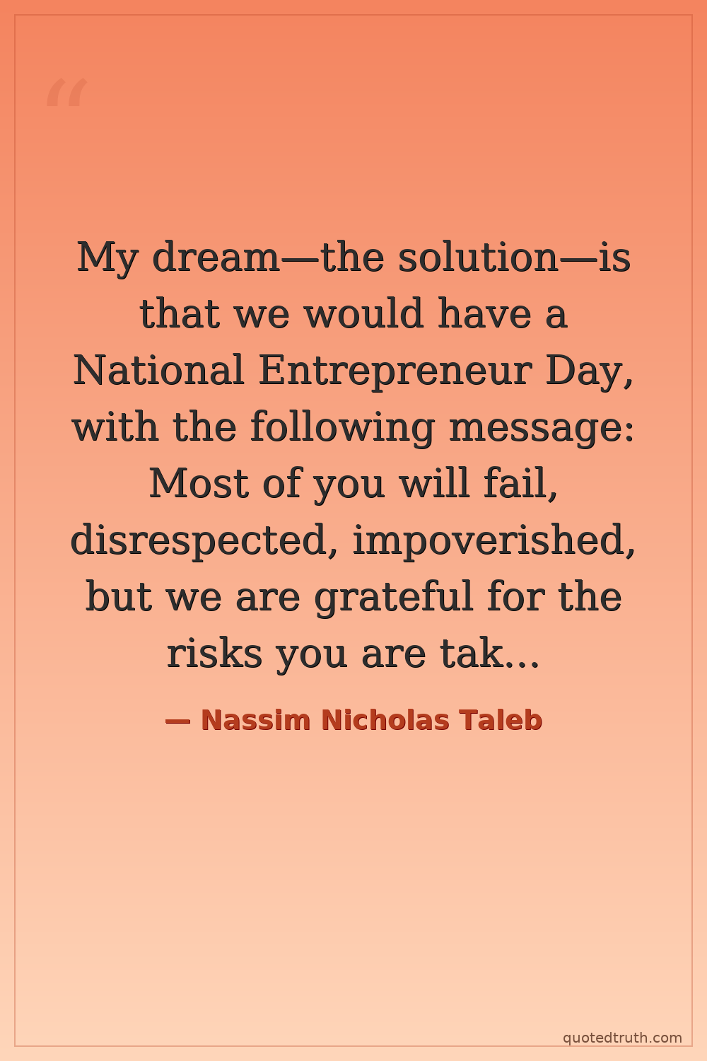 My dream—the solution—is that we would have a National Entrepreneur Day, with the following message: Most of you will fail, disrespected, impoverished, but we are grateful for the risks you are taking and the sacrifices you are making for the sake of the economic growth of the planet and pulling others out of poverty. You are at the source of our antifragility. Our nation thanks you.