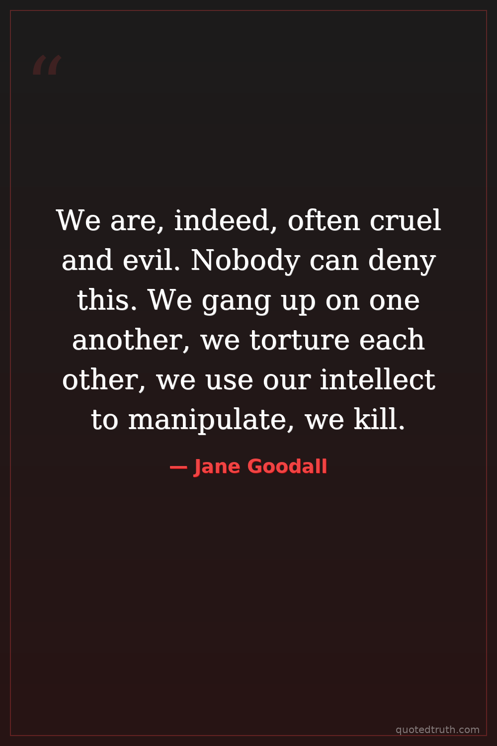 We are, indeed, often cruel and evil. Nobody can deny this. We gang up on one another, we torture each other, we use our intellect to manipulate, we kill.