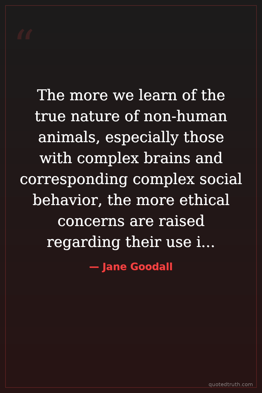 The more we learn of the true nature of non-human animals, especially those with complex brains and corresponding complex social behavior, the more ethical concerns are raised regarding their use in the service of man. — Jane Goodall Contemporary Primatology, chimpanzee research