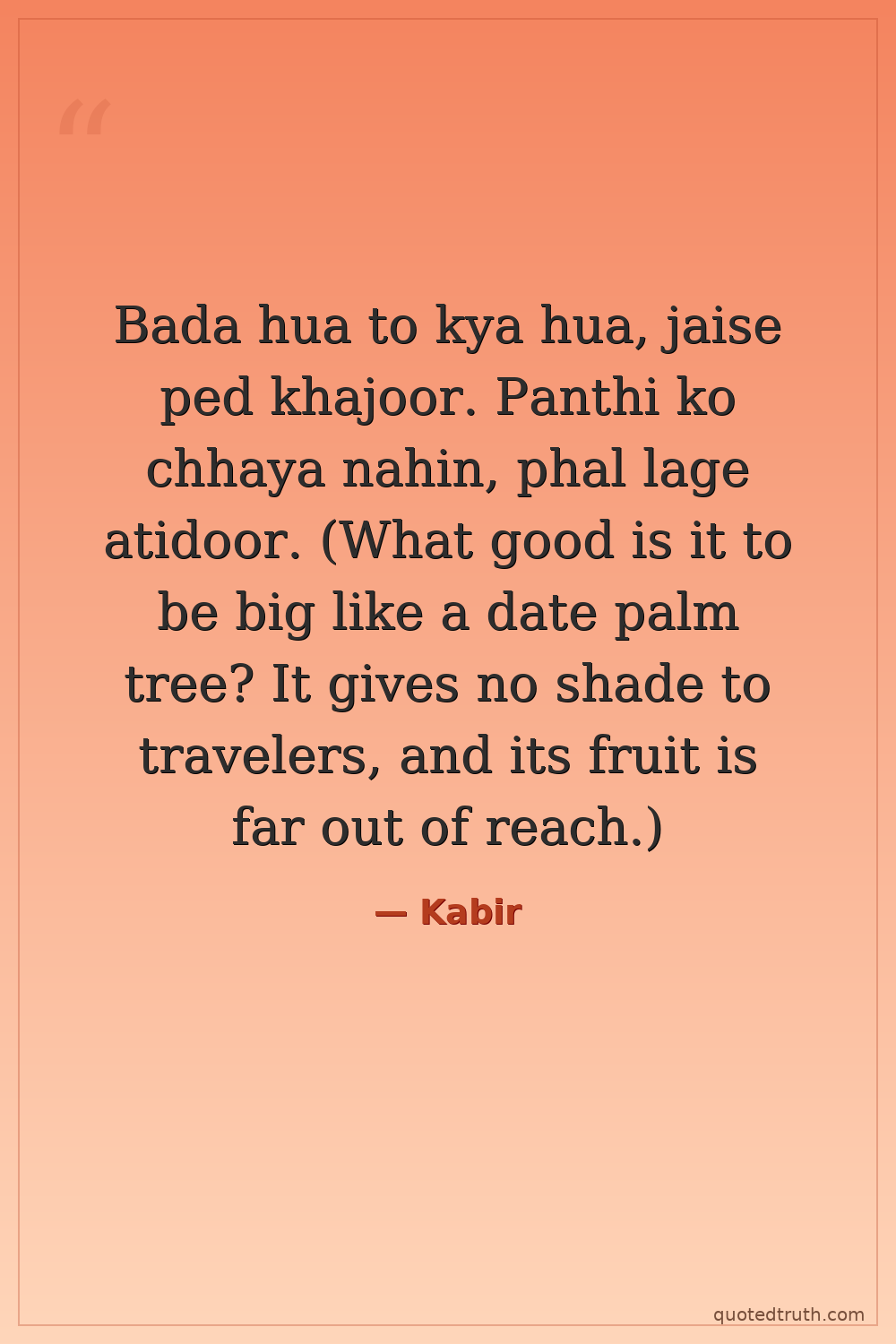 Bada hua to kya hua, jaise ped khajoor. Panthi ko chhaya nahin, phal lage atidoor. (What good is it to be big like a date palm tree? It gives no shade to travelers, and its fruit is far out of reach.)