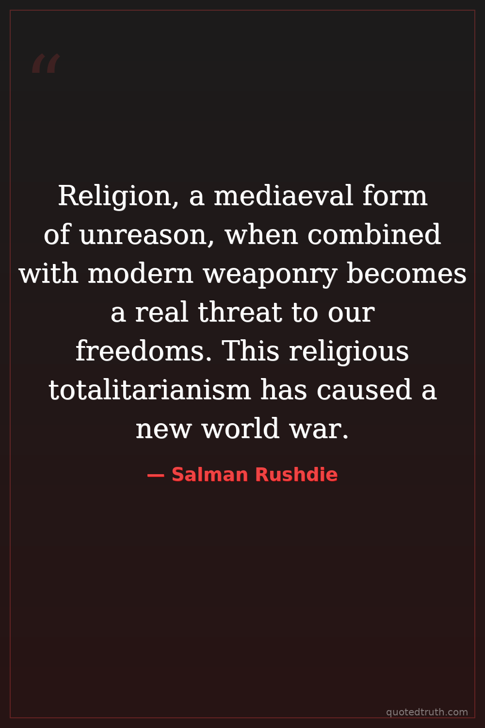 Religion, a mediaeval form of unreason, when combined with modern weaponry becomes a real threat to our freedoms. This religious totalitarianism has caused a new world war.
