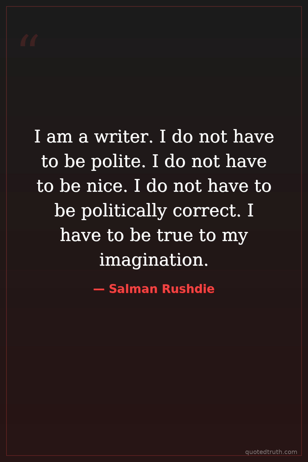 I am a writer. I do not have to be polite. I do not have to be nice. I do not have to be politically correct. I have to be true to my imagination.