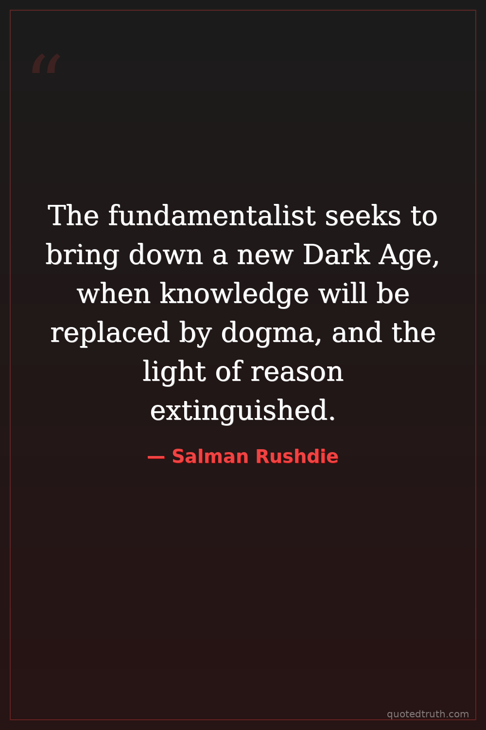 The fundamentalist seeks to bring down a new Dark Age, when knowledge will be replaced by dogma, and the light of reason extinguished.