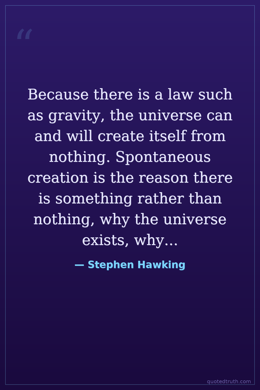 Because there is a law such as gravity, the universe can and will create itself from nothing. Spontaneous creation is the reason there is something rather than nothing, why the universe exists, why we exist.