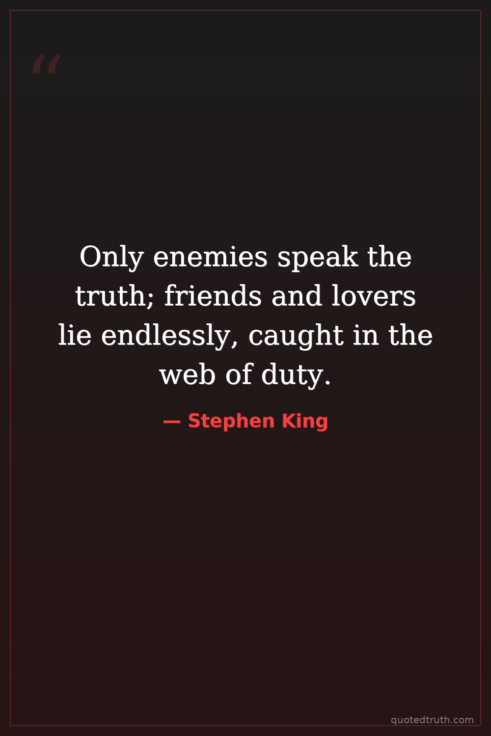 Only enemies speak the truth; friends and lovers lie endlessly, caught in the web of duty.