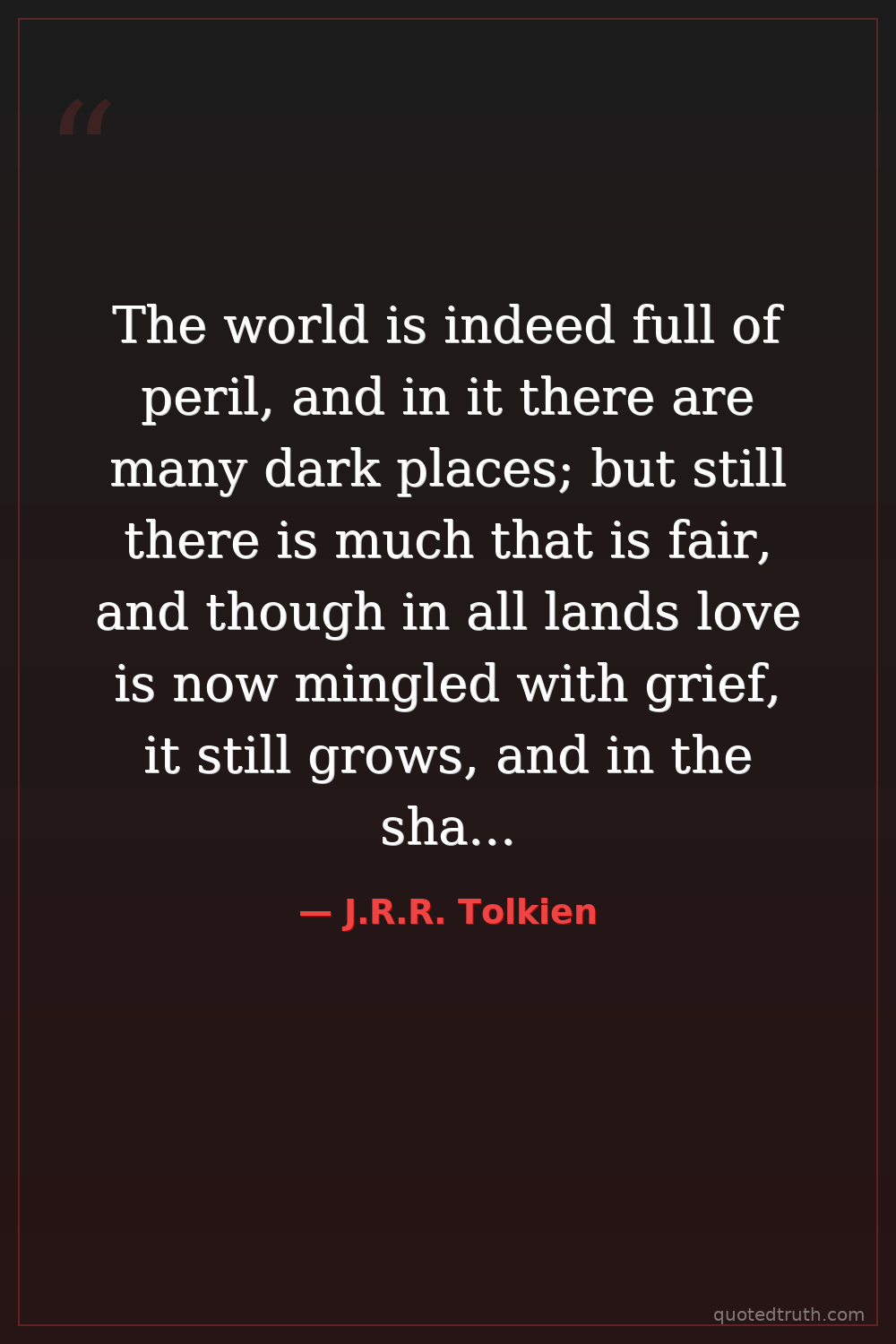 The world is indeed full of peril, and in it there are many dark places; but still there is much that is fair, and though in all lands love is now mingled with grief, it still grows, and in the shadow of its pain it is stronger.