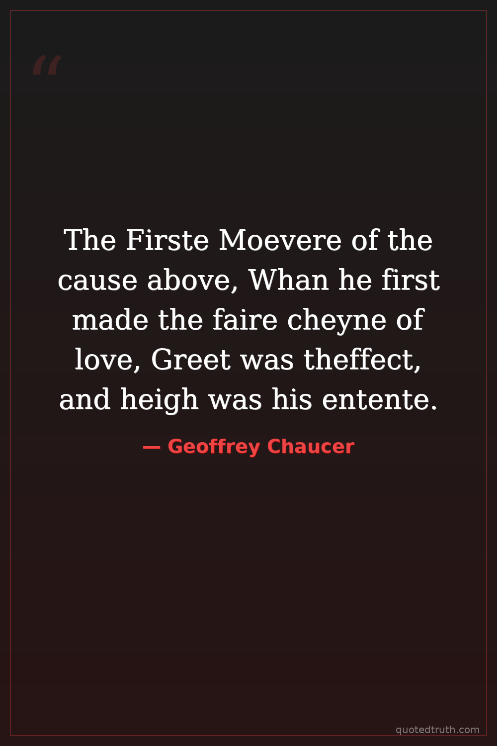The Firste Moevere of the cause above, Whan he first made the faire cheyne of love, Greet was theffect, and heigh was his entente.