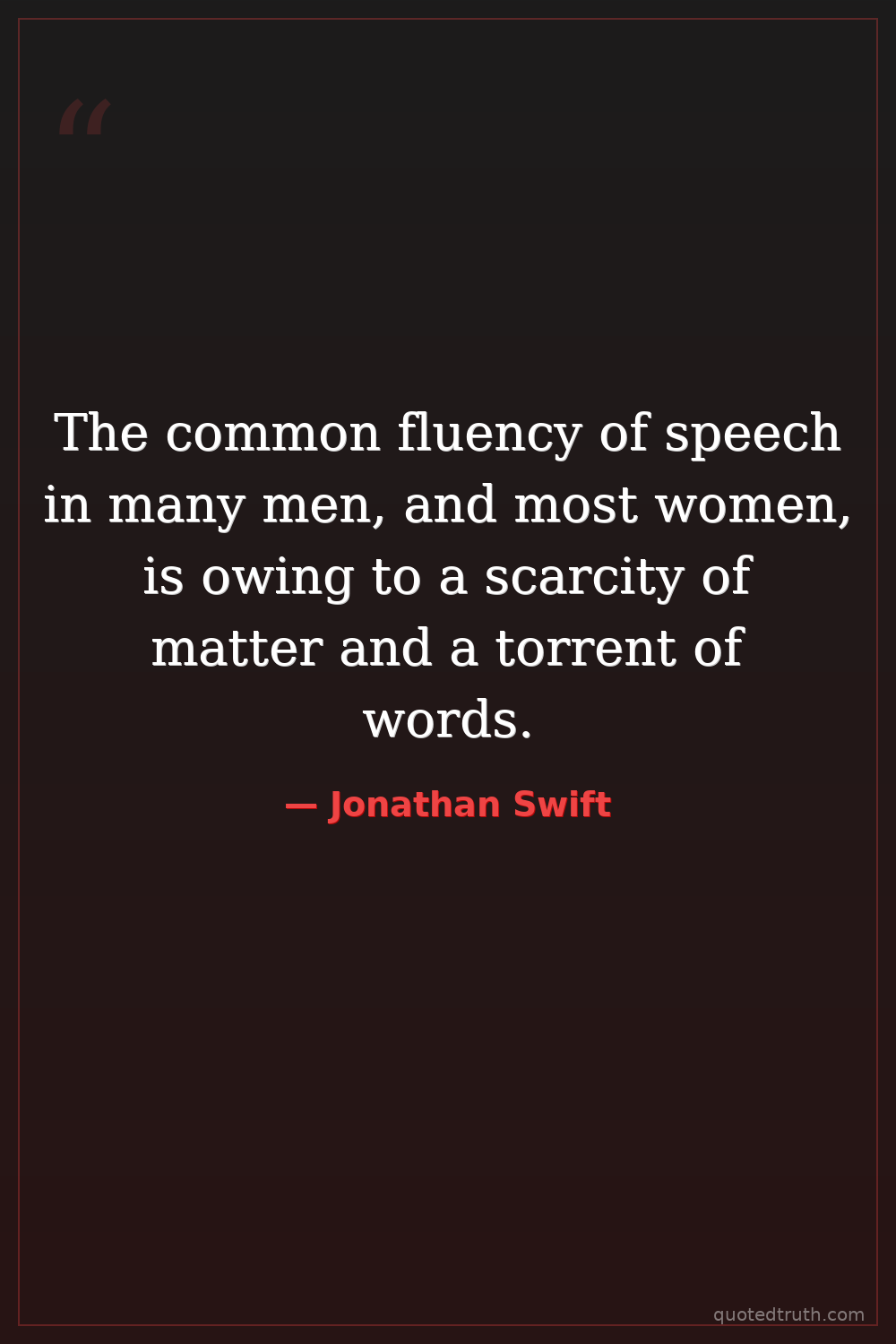 Humorous"The common fluency of speech in many men, and most women, is owing to a scarcity of matter and a torrent of words; for whoever is master of an art, and hath a proper fund of materials, and a suitable …"