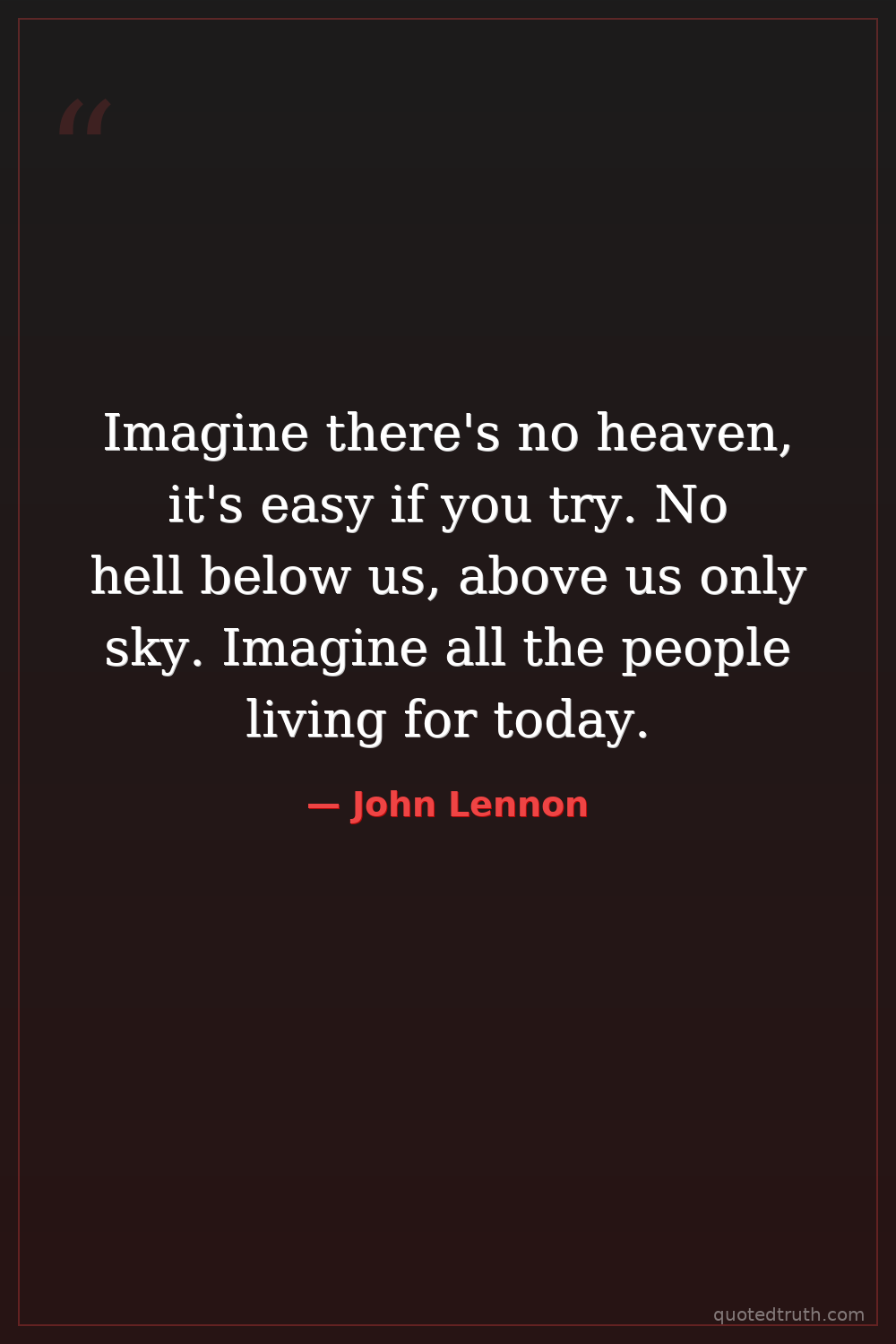 Imagine there's no heaven, it's easy if you try. No hell below us, above us only sky. Imagine all the people living for today.