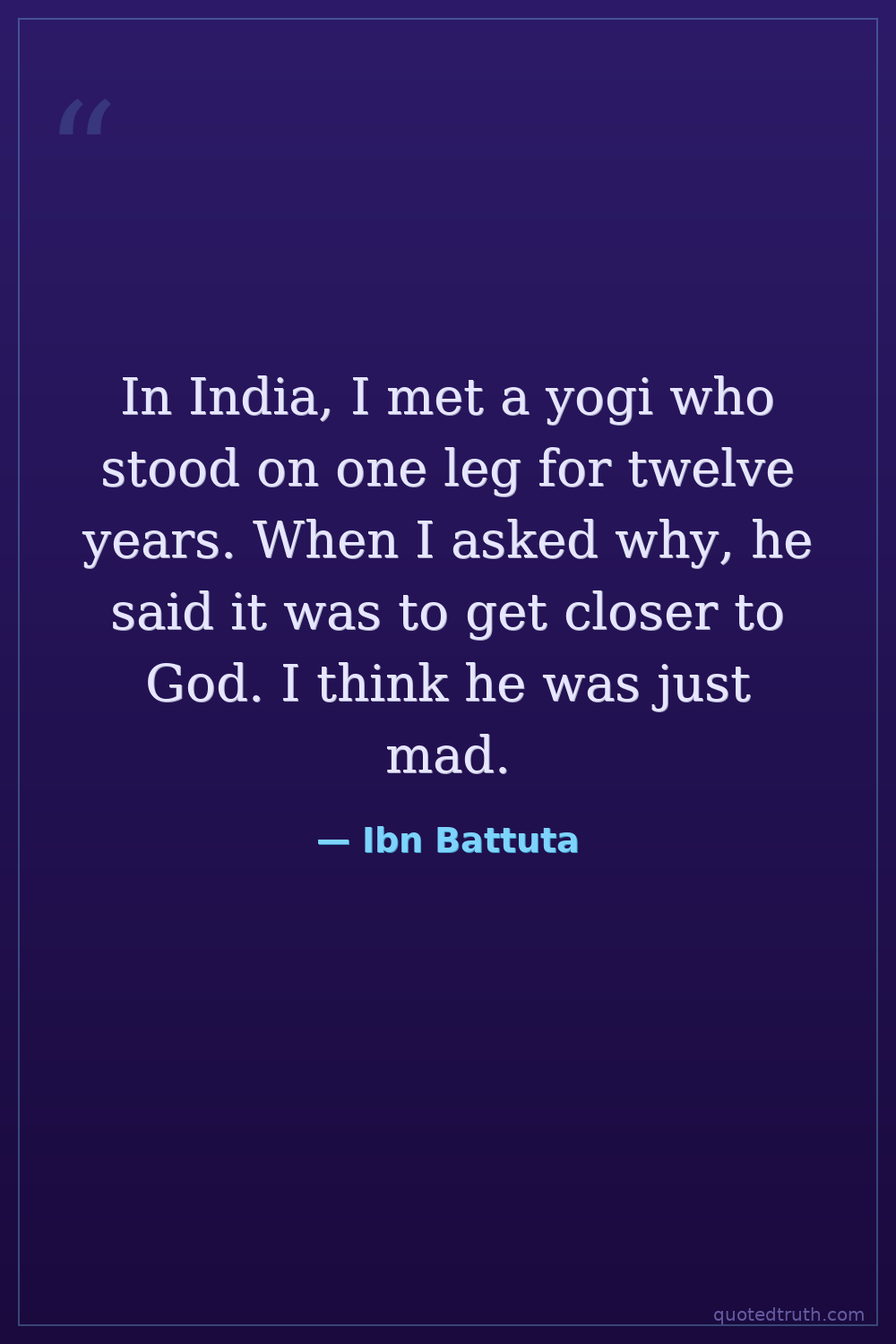 In India, I met a yogi who stood on one leg for twelve years. When I asked why, he said it was to get closer to God. I think he was just mad.