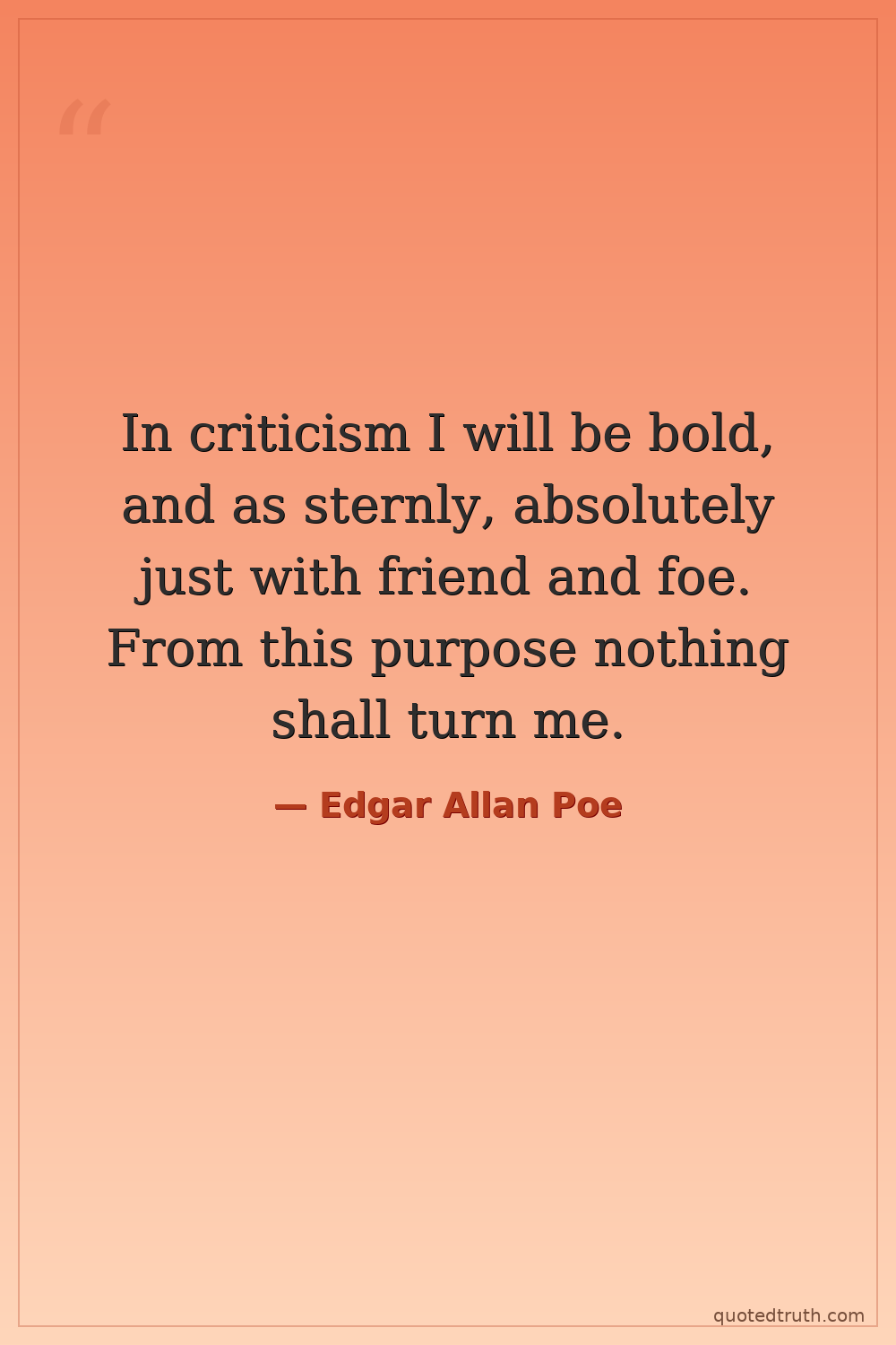 In criticism I will be bold, and as sternly, absolutely just with friend and foe. From this purpose nothing shall turn me.