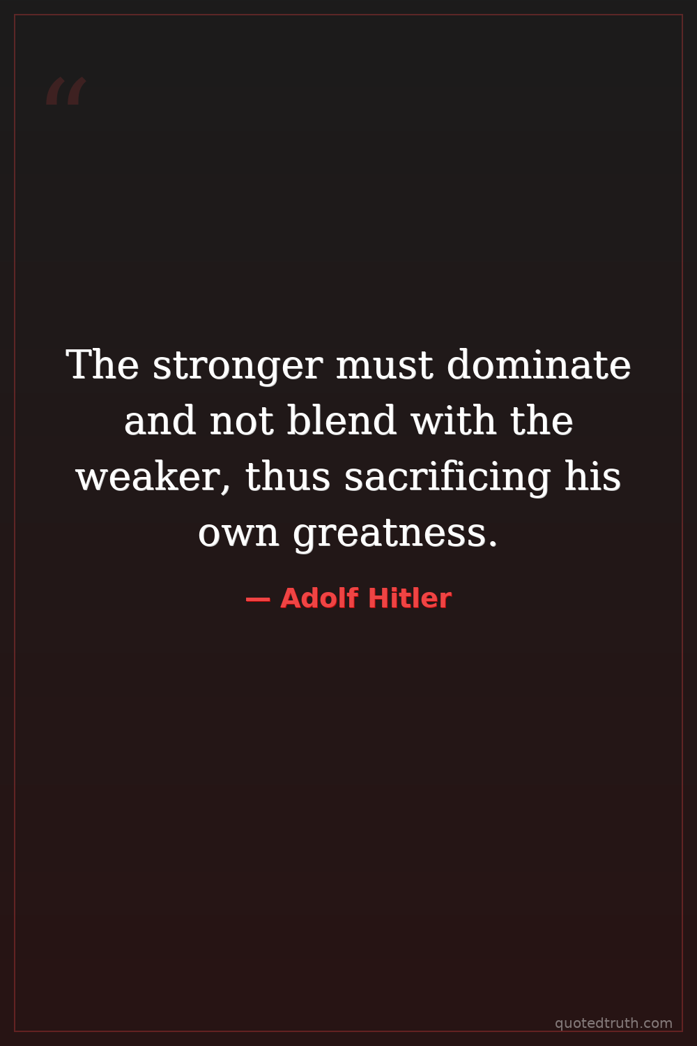Controversial"The stronger must dominate and not mate with the weaker, because if he does, he sacrifices all of his own strength. If a people wants to live, it must fight for its existence, and if it does not fight…"