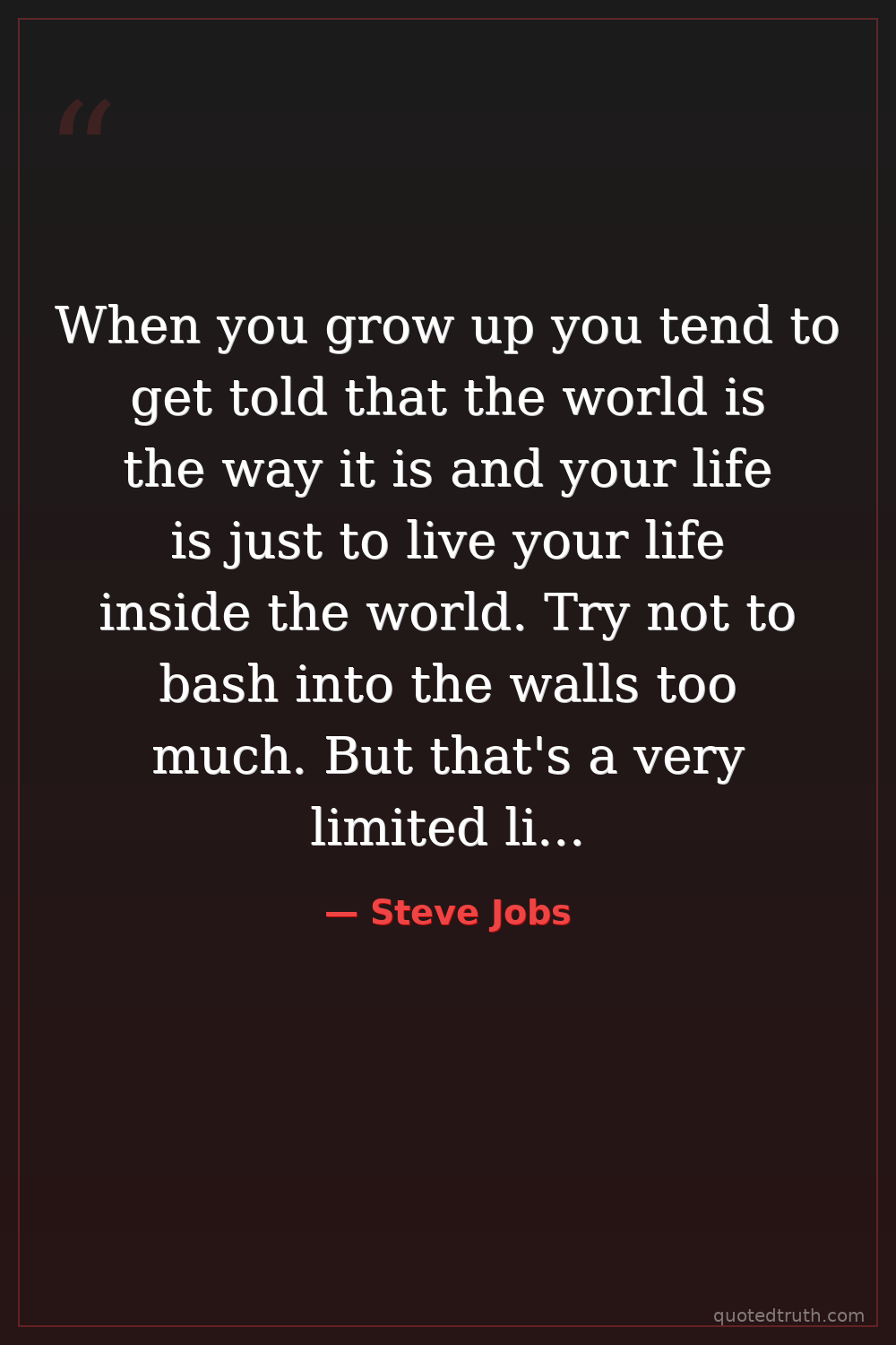 When you grow up you tend to get told that the world is the way it is and your life is just to live your life inside the world. Try not to bash into the walls too much. But that's a very limited life. Life can be much broader once you discover one simple fact: Everything around you that you call life was made up by people that were no smarter than you. And you can change it, you can influence it, you can build your own things that other people can use.