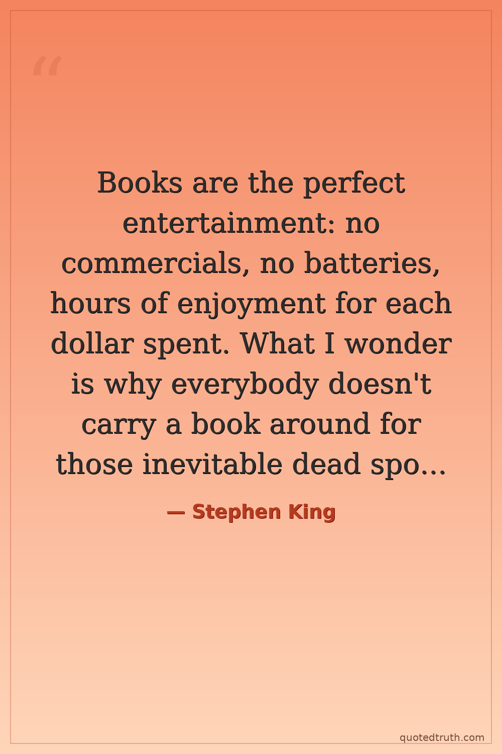 Books are the perfect entertainment: no commercials, no batteries, hours of enjoyment for each dollar spent. What I wonder is why everybody doesn't carry a book around for those inevitable dead spots in life.