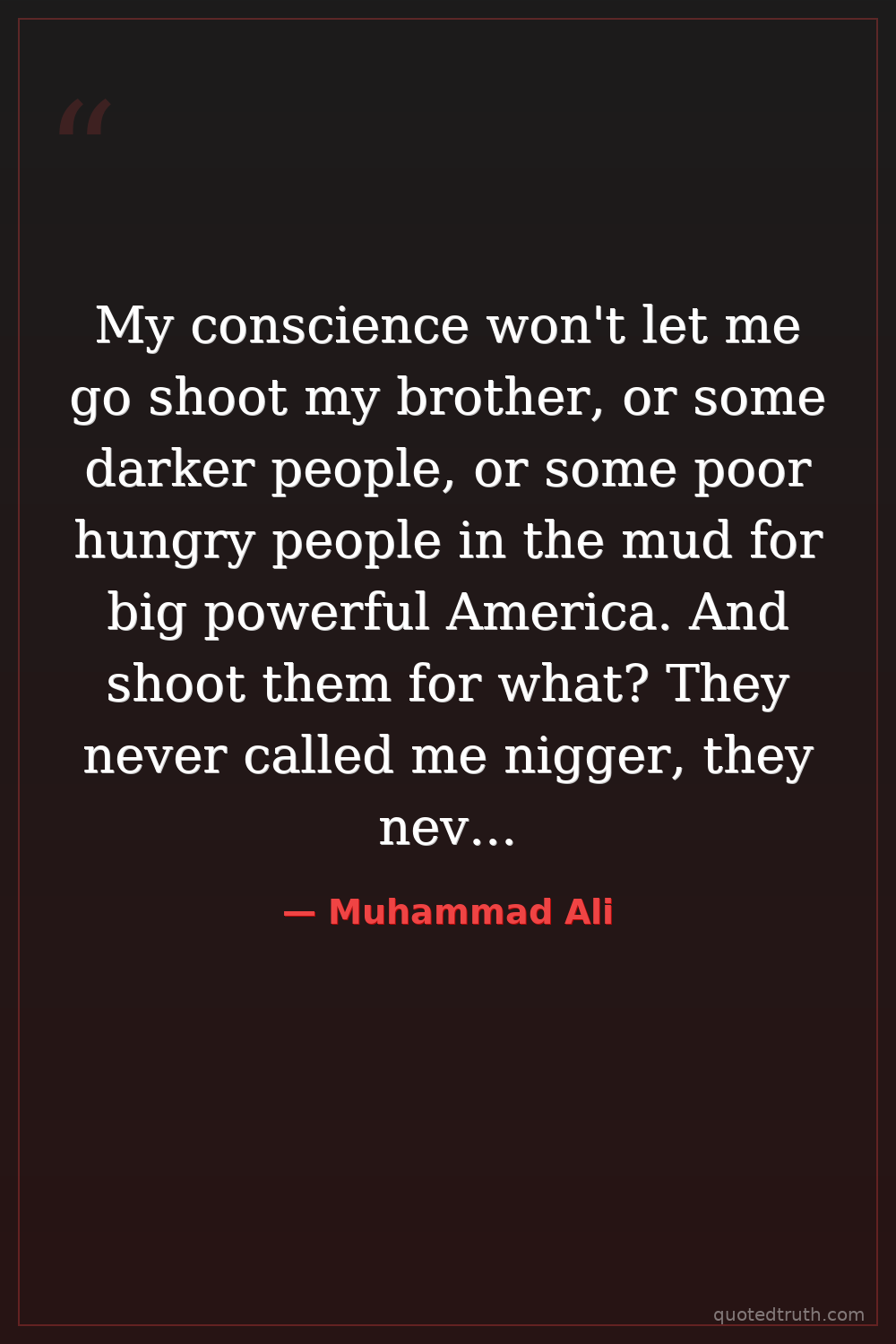 My conscience won't let me go shoot my brother, or some darker people, or some poor hungry people in the mud for big powerful America. And shoot them for what? They never called me nigger, they never lynched me, they didn't put no dogs on me, they didn't rob me of my nationality, raped and killed my mother and father. ... How can I shoot them poor people? Just take me to jail.