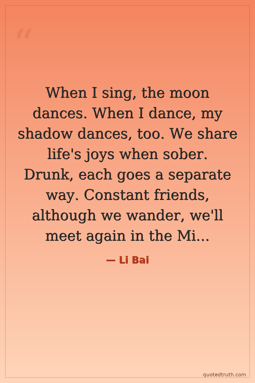 When I sing, the moon dances. When I dance, my shadow dances, too. We share life's joys when sober. Drunk, each goes a separate way. Constant friends, although we wander, we'll meet again in the Milky Way.