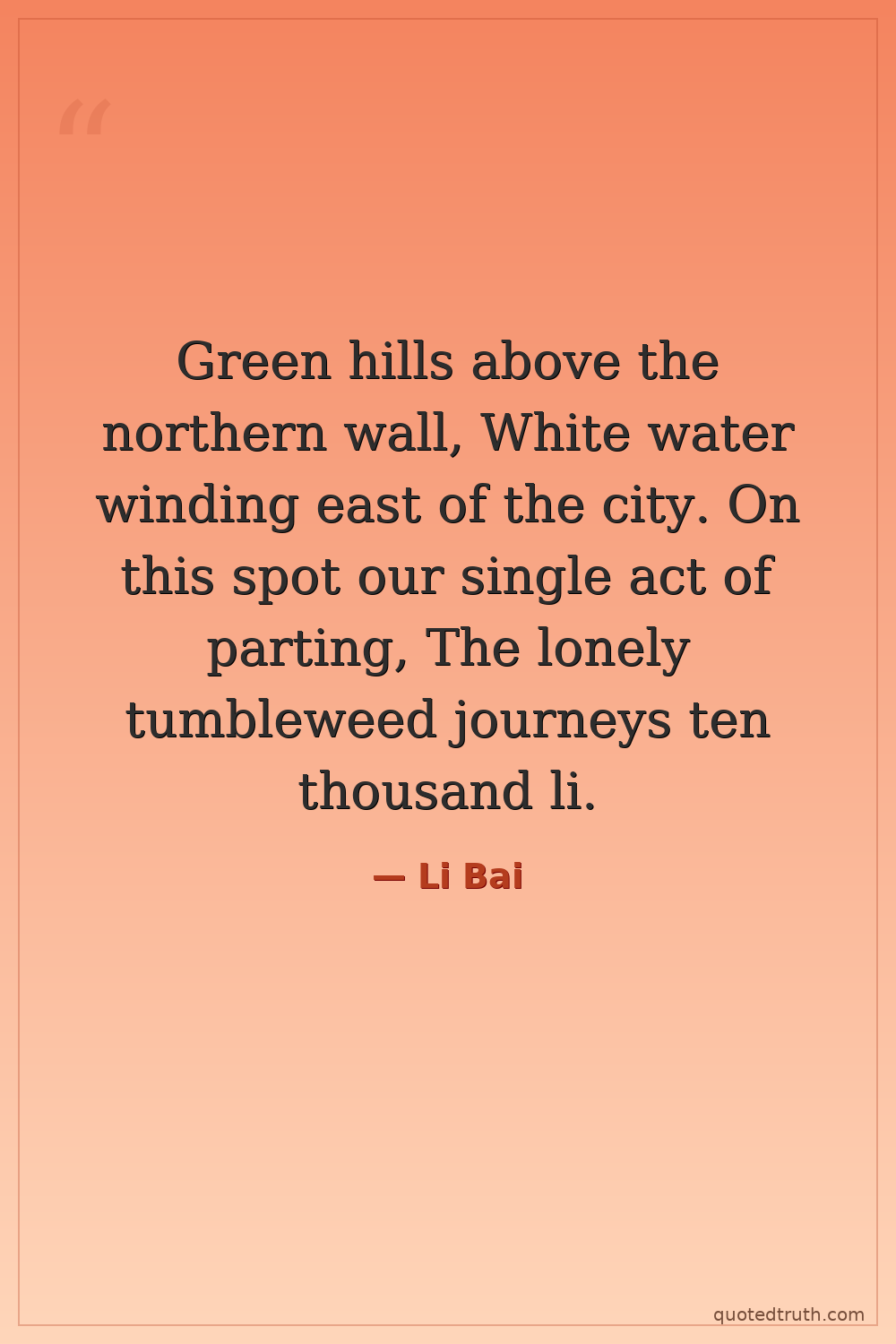 Green hills above the northern wall, White water winding east of the city. On this spot our single act of parting, The lonely tumbleweed journeys ten thousand li.