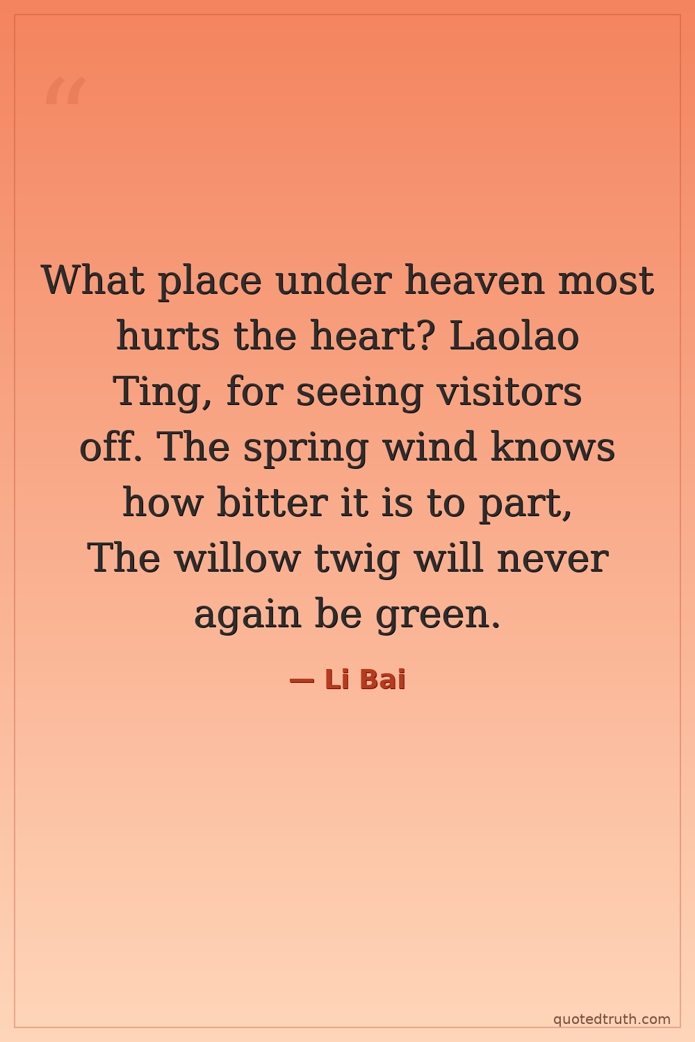 What place under heaven most hurts the heart? Laolao Ting, for seeing visitors off. The spring wind knows how bitter it is to part, The willow twig will never again be green.