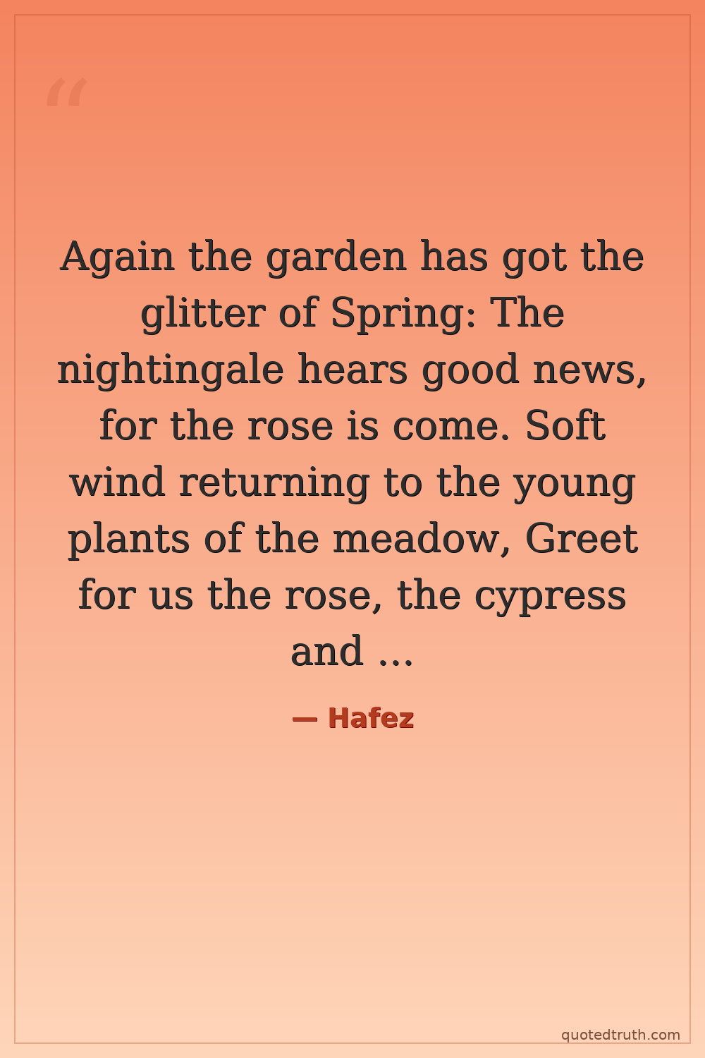 Again the garden has got the glitter of Spring: The nightingale hears good news, for the rose is come. Soft wind returning to the young plants of the meadow, Greet for us the rose, the cypress and the sweet basil. They are spread for the wedding-feast of the wine-seller's son, And I'd sweep his floor with my eyelashes to win such grace.