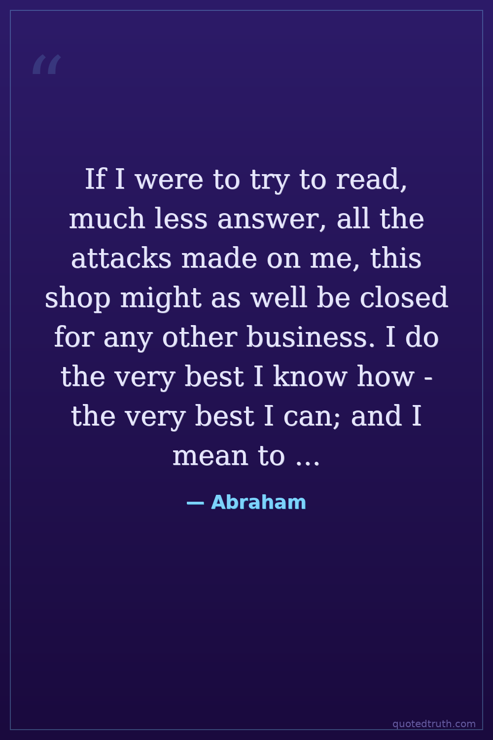 If I were to try to read, much less answer, all the attacks made on me, this shop might as well be closed for any other business. I do the very best I know how - the very best I can; and I mean to keep doing so until the end. If the end brings me out all right, what is said against me won't amount to anything. If the end brings me out wrong, ten angels swearing I was right would make no difference.