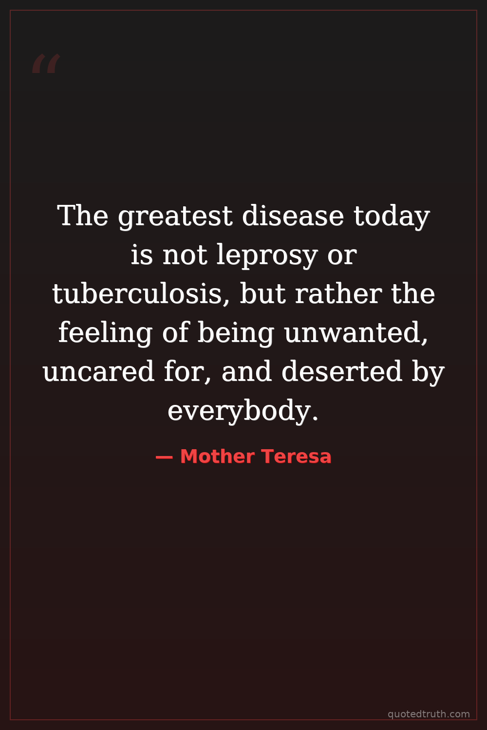 The greatest disease today is not leprosy or tuberculosis, but rather the feeling of being unwanted, uncared for, and deserted by everybody.