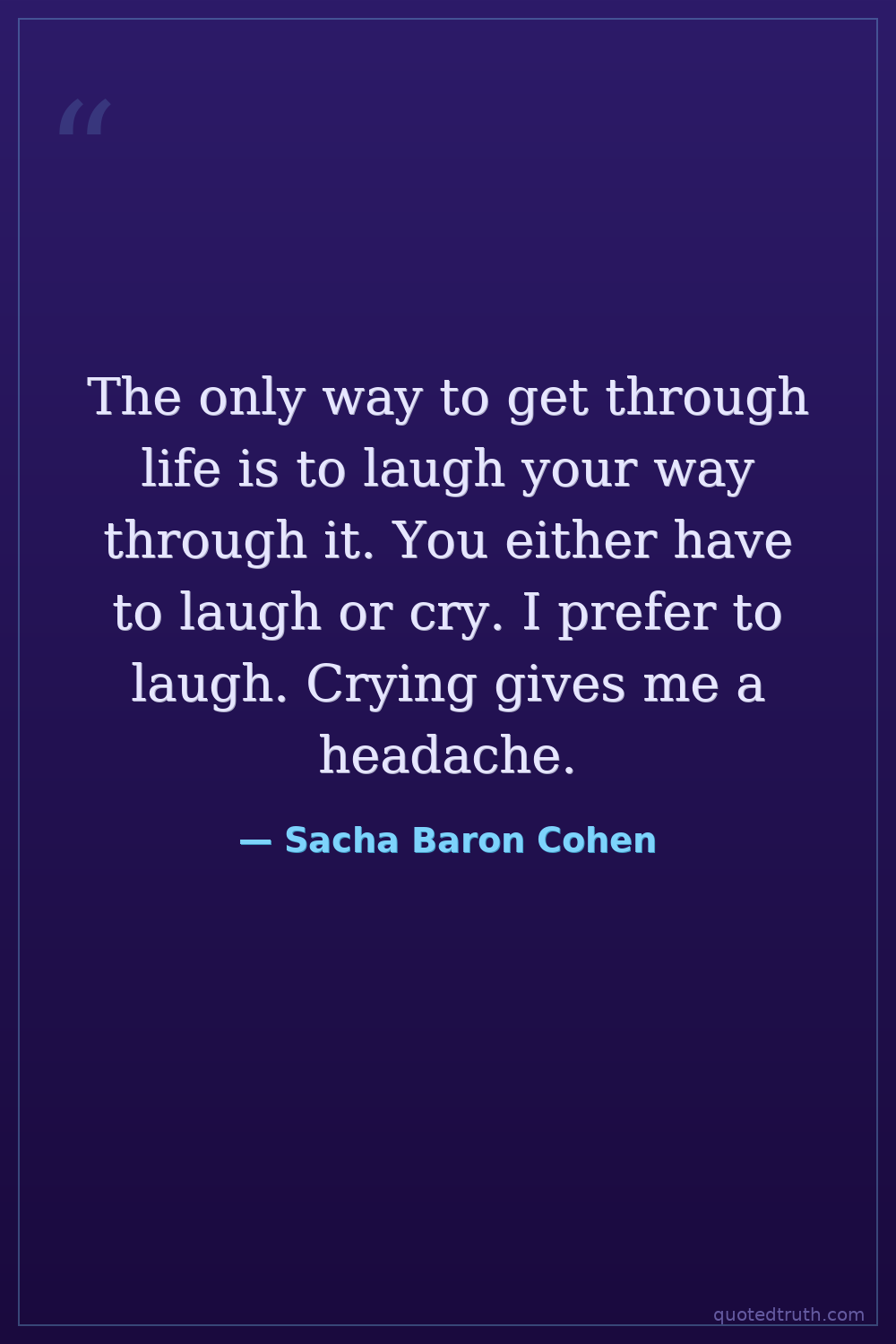 The only way to get through life is to laugh your way through it. You either have to laugh or cry. I prefer to laugh. Crying gives me a headache.