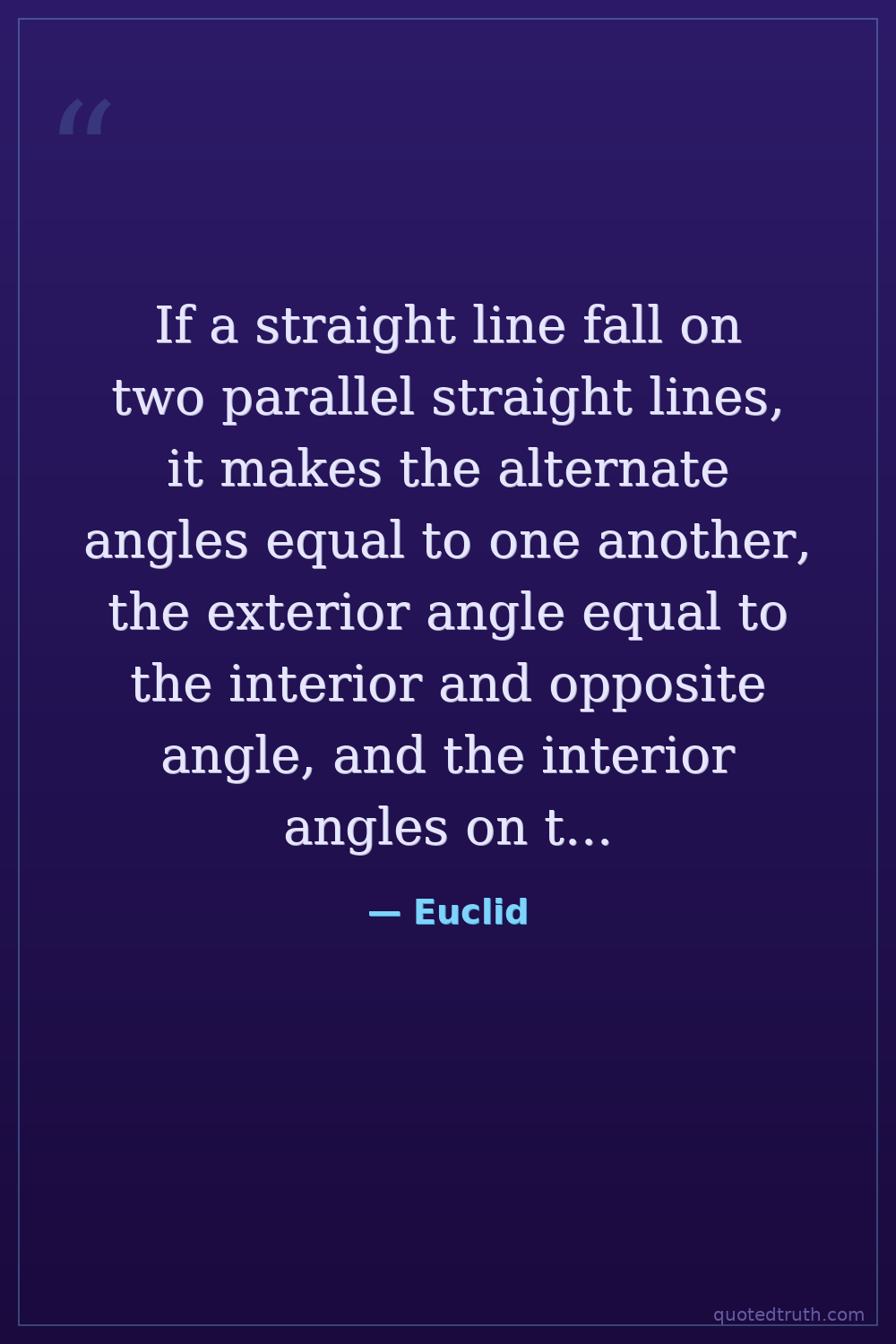 If a straight line fall on two parallel straight lines, it makes the alternate angles equal to one another, the exterior angle equal to the interior and opposite angle, and the interior angles on the same side equal to two right angles.