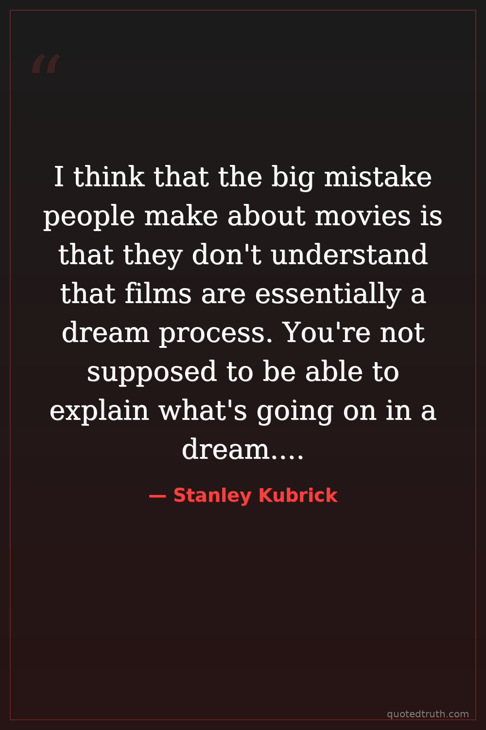 I think that the big mistake people make about movies is that they don't understand that films are essentially a dream process. You're not supposed to be able to explain what's going on in a dream. If you can, it's not a dream.