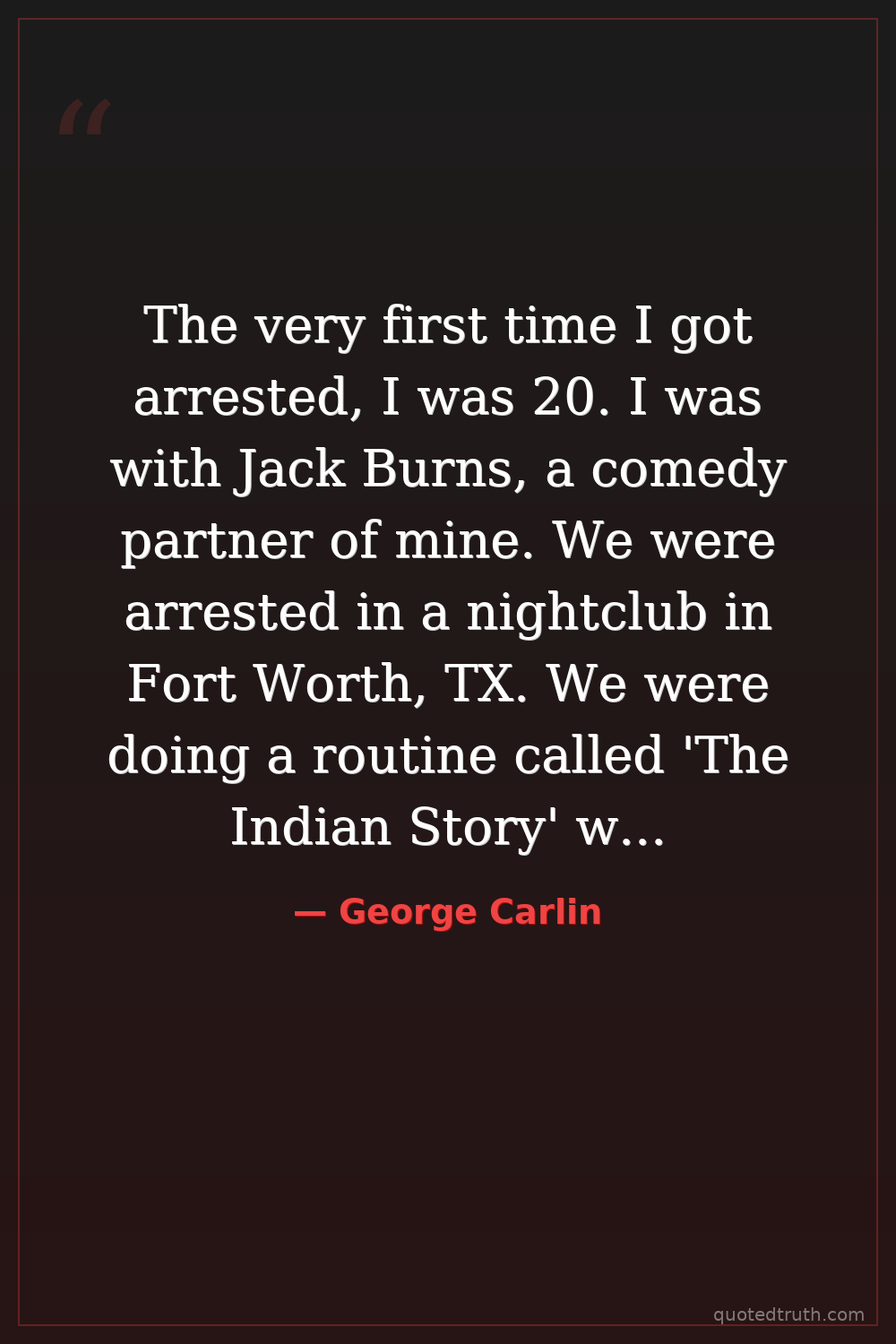 The very first time I got arrested, I was 20. I was with Jack Burns, a comedy partner of mine. We were arrested in a nightclub in Fort Worth, TX. We were doing a routine called 'The Indian Story' which was about the Indians getting screwed. The cops didn't like it. They said, 'You're doing communist material.'