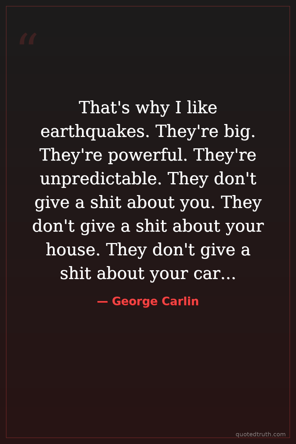 That's why I like earthquakes. They're big. They're powerful. They're unpredictable. They don't give a shit about you. They don't give a shit about your house. They don't give a shit about your car. They just do what they do.