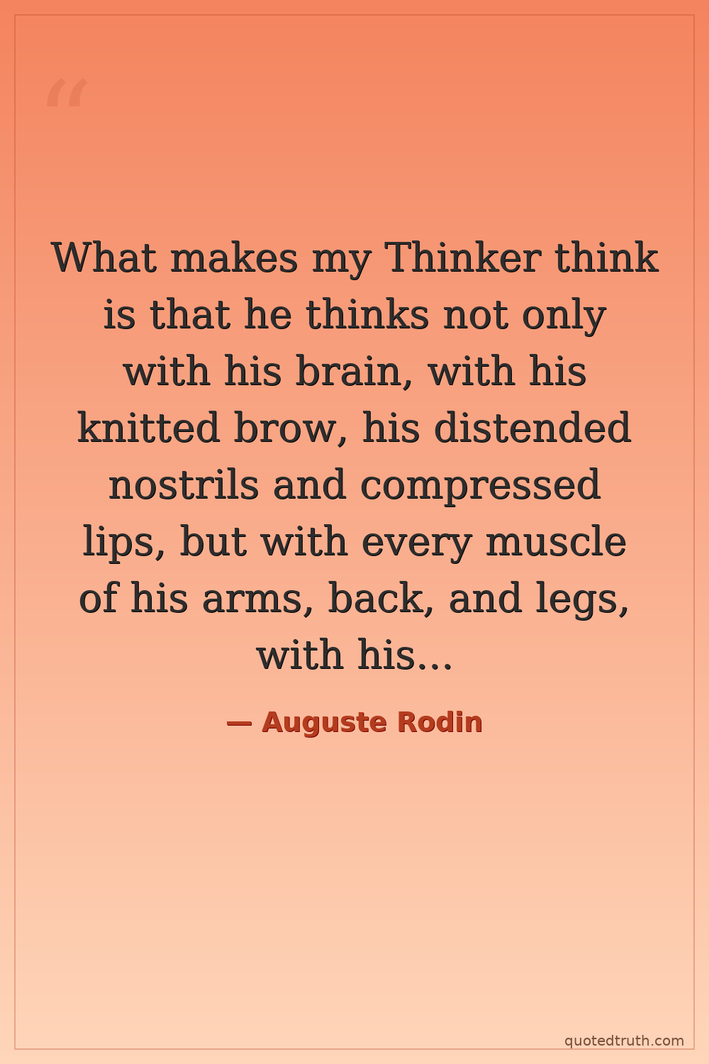 What makes my Thinker think is that he thinks not only with his brain, with his knitted brow, his distended nostrils and compressed lips, but with every muscle of his arms, back, and legs, with his clenched fist and gripping toes. — Auguste Rodin Modern The Thinker, sculptor