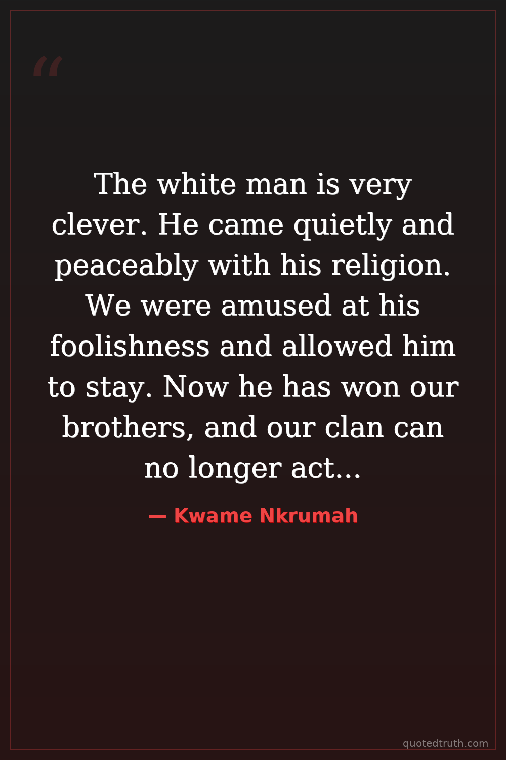 The white man is very clever. He came quietly and peaceably with his religion. We were amused at his foolishness and allowed him to stay. Now he has won our brothers, and our clan can no longer act like one. He has put a knife on the things that held us together and we have fallen apart.
