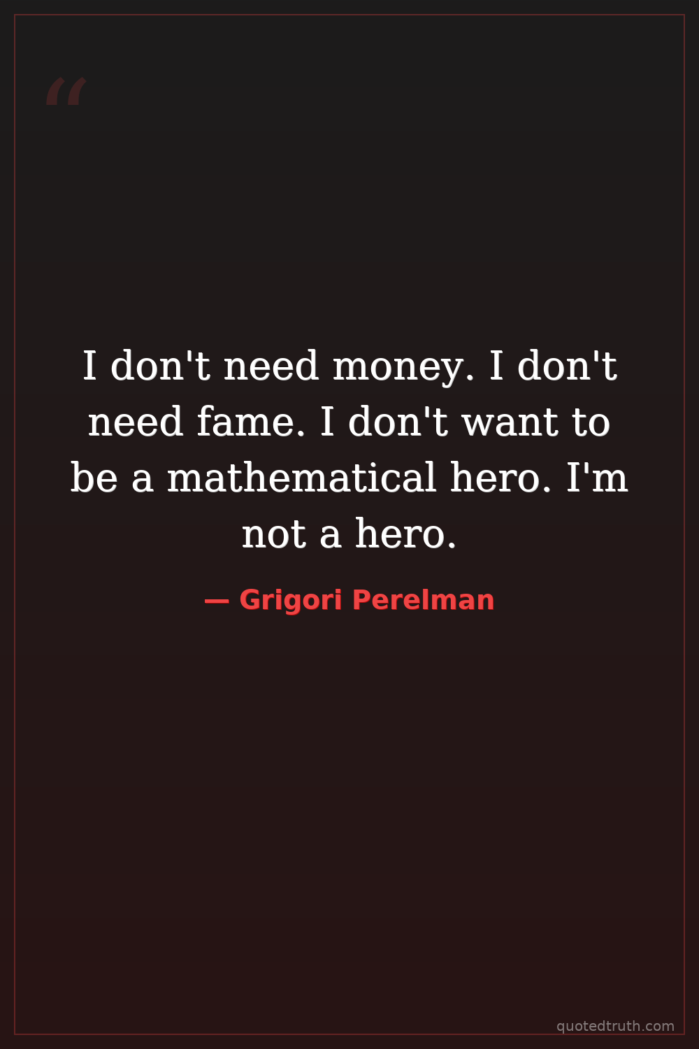 I don't need money. I don't need fame. I don't want to be a mathematical hero. I'm not a hero.