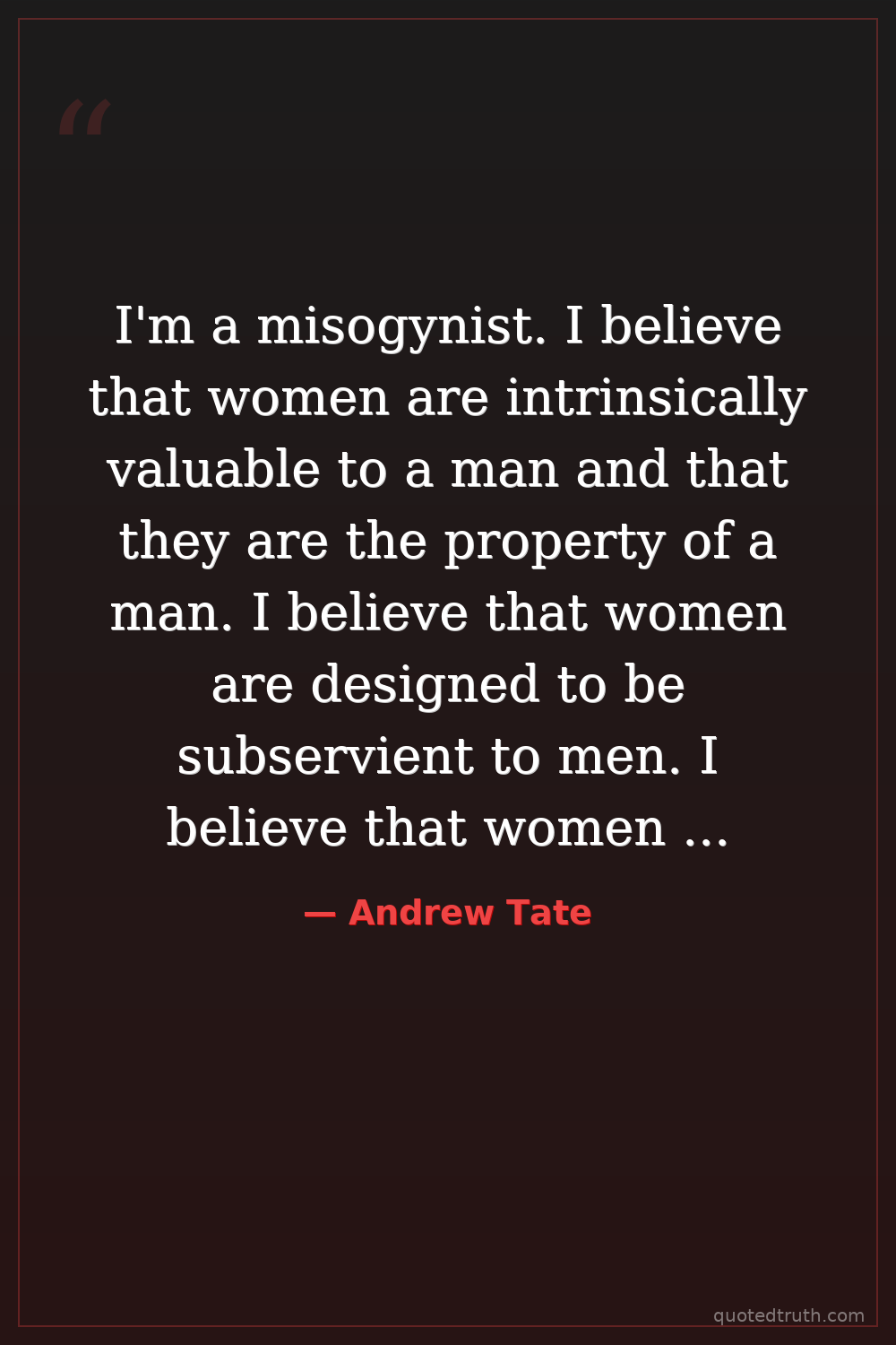I'm a misogynist. I believe that women are intrinsically valuable to a man and that they are the property of a man. I believe that women are designed to be subservient to men. I believe that women are designed to be homemakers and mothers. I believe women are designed to be beautiful objects for men to look at.