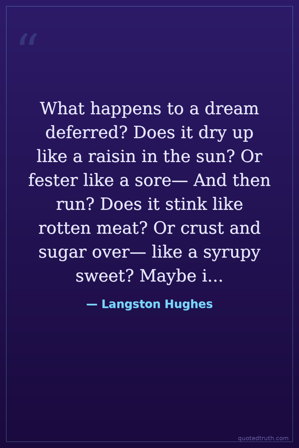 What happens to a dream deferred? Does it dry up like a raisin in the sun? Or fester like a sore— And then run? Does it stink like rotten meat? Or crust and sugar over— like a syrupy sweet? Maybe it just sags like a heavy load. Or does it explode?