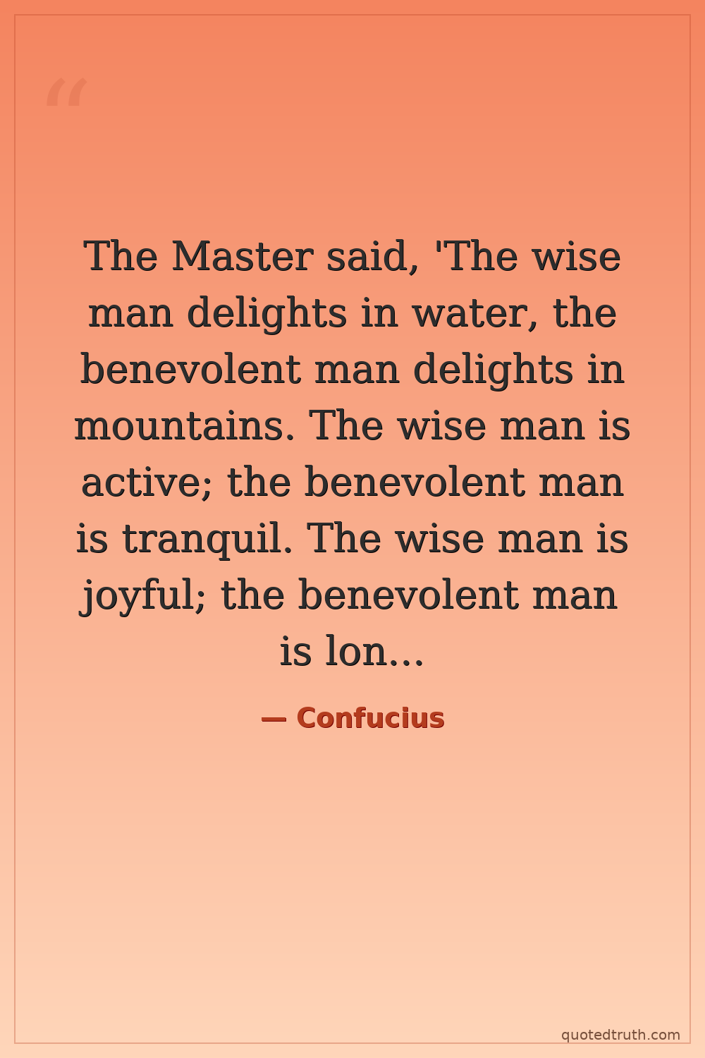 The Master said, 'The wise man delights in water, the benevolent man delights in mountains. The wise man is active; the benevolent man is tranquil. The wise man is joyful; the benevolent man is long-lived.' — Confucius Ancient Chinese philosopher, founder of Confucianism