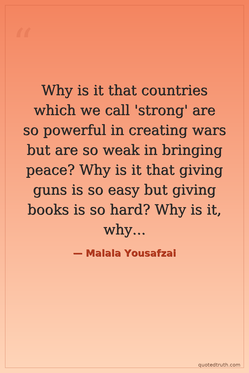 Why is it that countries which we call 'strong' are so powerful in creating wars but are so weak in bringing peace? Why is it that giving guns is so easy but giving books is so hard? Why is it, why is it that making tanks is so easy, but building schools is so hard?