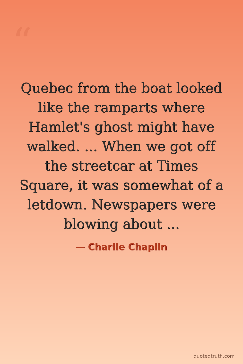 Quebec from the boat looked like the ramparts where Hamlet's ghost might have walked. ... When we got off the streetcar at Times Square, it was somewhat of a letdown. Newspapers were blowing about the road and pavement, and Broadway looked seedy, like a slovenly woman just out of bed.