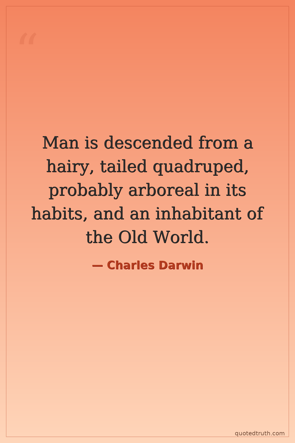 Man is descended from a hairy, tailed quadruped, probably arboreal in its habits, and an inhabitant of the Old World.