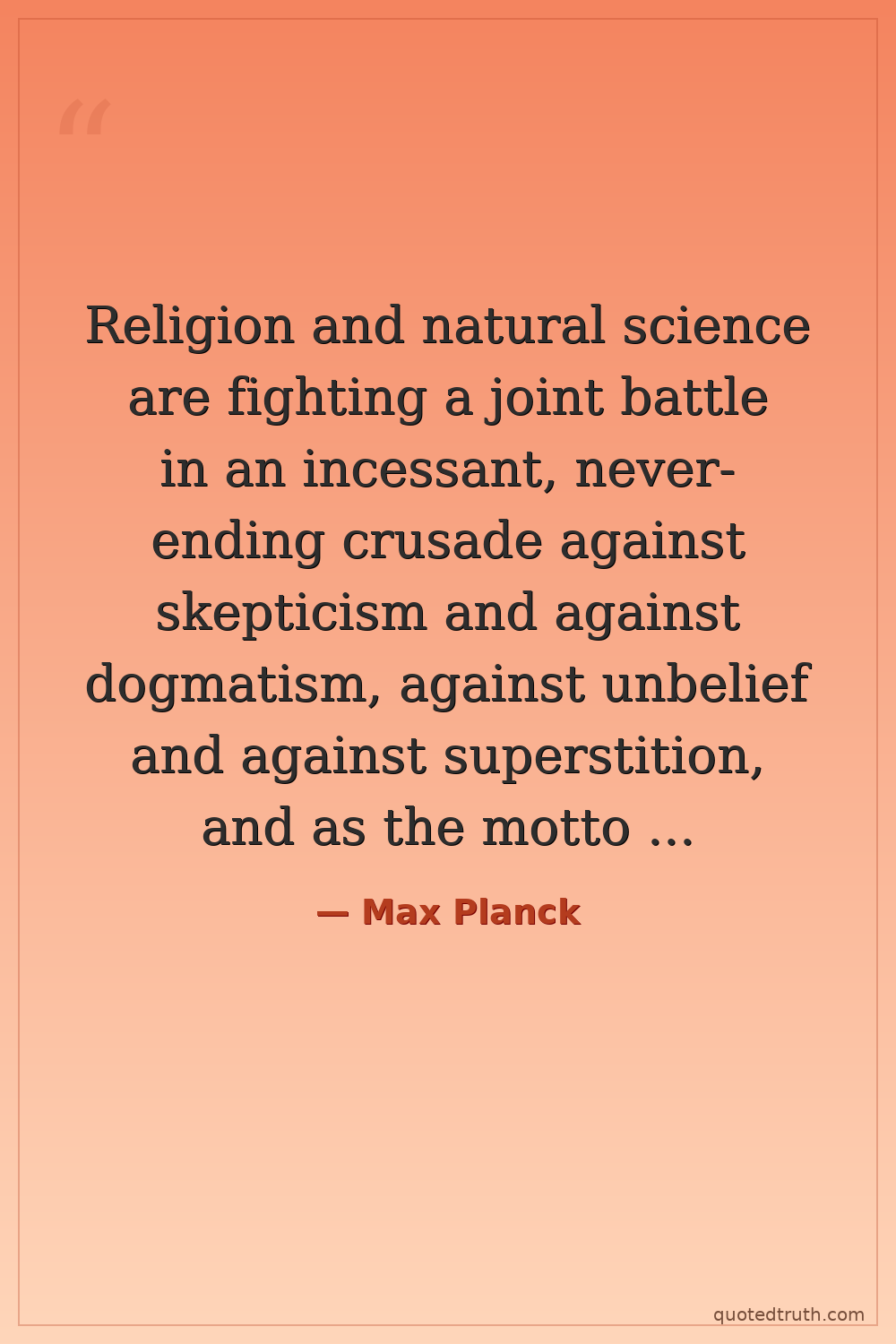 Religion and natural science are fighting a joint battle in an incessant, never-ending crusade against skepticism and against dogmatism, against unbelief and against superstition, and as the motto for this crusade has always been, and always will be, 'On to God!'